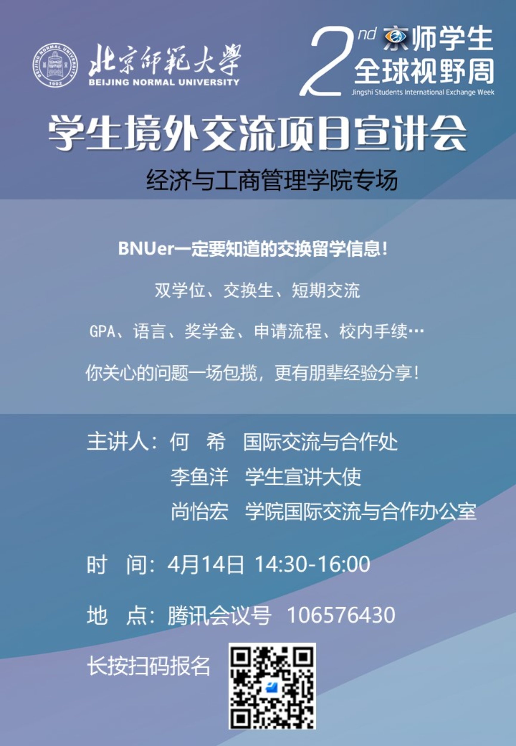 为进一步落实学生全球胜任力战略,让更多学生了解学校境外交流项目相关信息,第二届京师学生全球视野周活动之一“学生境外交流项目宣讲会”将于2022年4月14日在femboy 开讲,欢迎同学们报名参加!