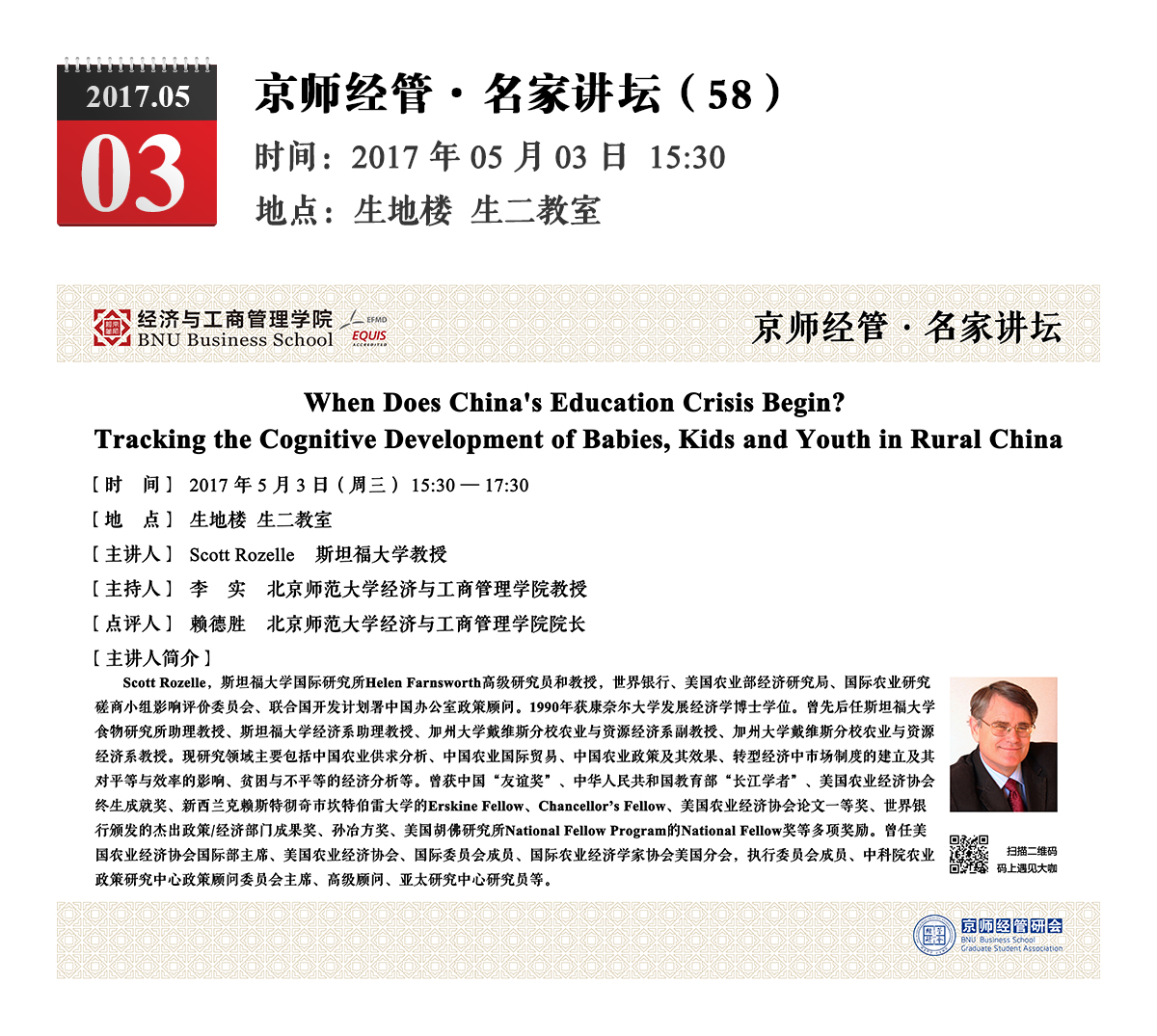 京师经管·名家讲坛(58)——When Does China's Education Crisis Begin? Tracking the Cognitive Development of Babies, Kids and Youth in Rural China