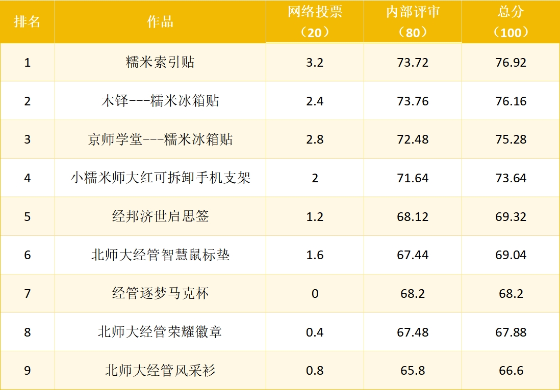 在糯米文创设计大赛中,同学们热情参与,我们共收到了 8 位同学的 9 份稿件。经过为期5天的网络投票和院内评审,文创大赛的评分结果现已统计完毕。快来看看你的心仪文创有没有获奖吧!