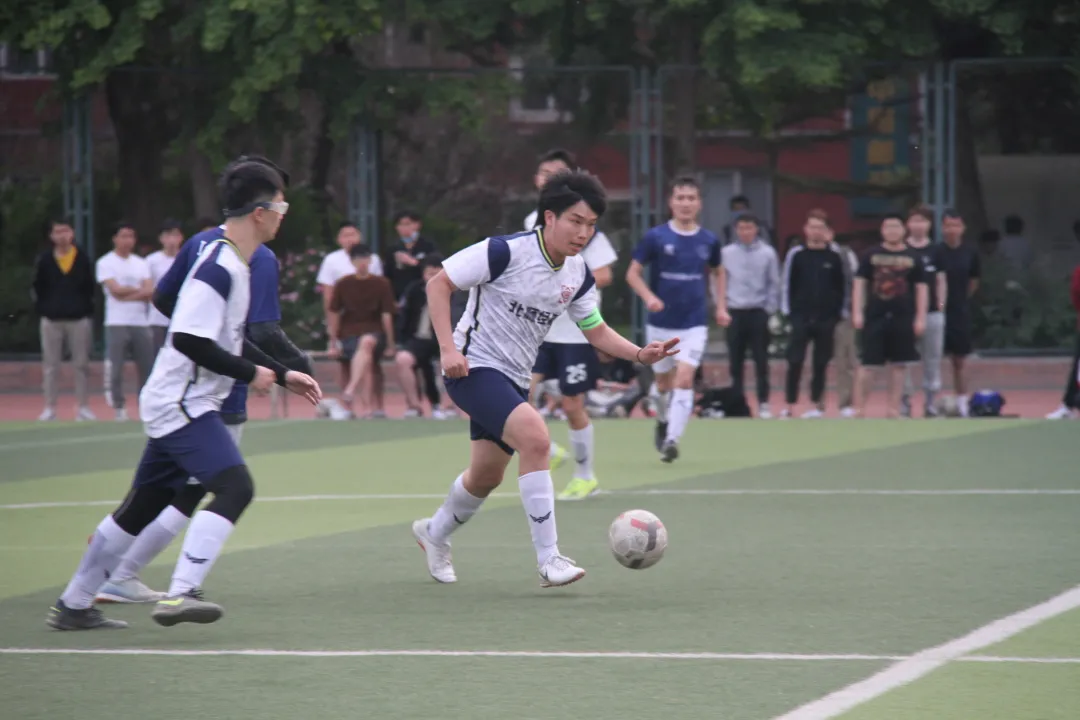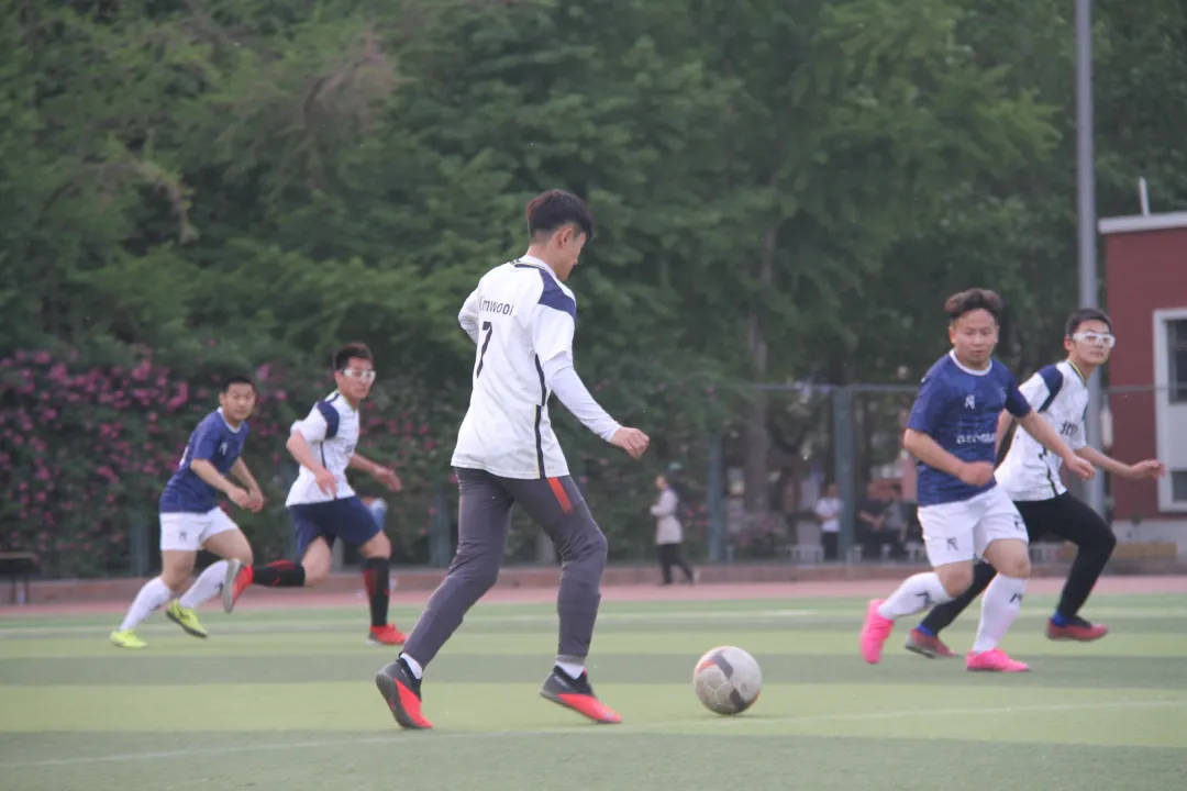 伴随着裁判的一声哨响,上半场比赛拉开帷幕。经管男足身着白色战衣,奋力奔跑的道道身影展现出他们昂扬的斗志与必胜的决心。中场开球,我方率先取得球权并迅速进入比赛状态,足球在双方球员脚下来回穿梭,你来我往,互不相让,但在我方球员的互相配合下,始终压在对方半场。