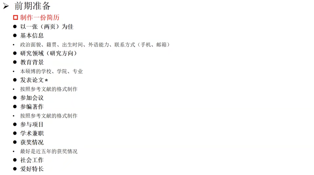 在求职的前期准备方面,赵心慧师姐从简历制作、信息整理、个人材料整合和面试准备四个方面进行介绍。在制作简历时,除基本信息外,要着重突出发表论文、参加会议、参编著作和参与项目情况,展现自己良好的学术潜质。助教助管经历、亮眼的爱好特长也是加分项。