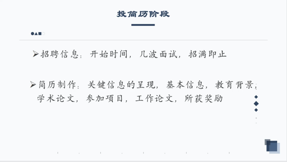 宋肖肖师兄根据求职时间线,主要从投简历和面试阶段为大家介绍了一些求职技巧和个人经验教训。
