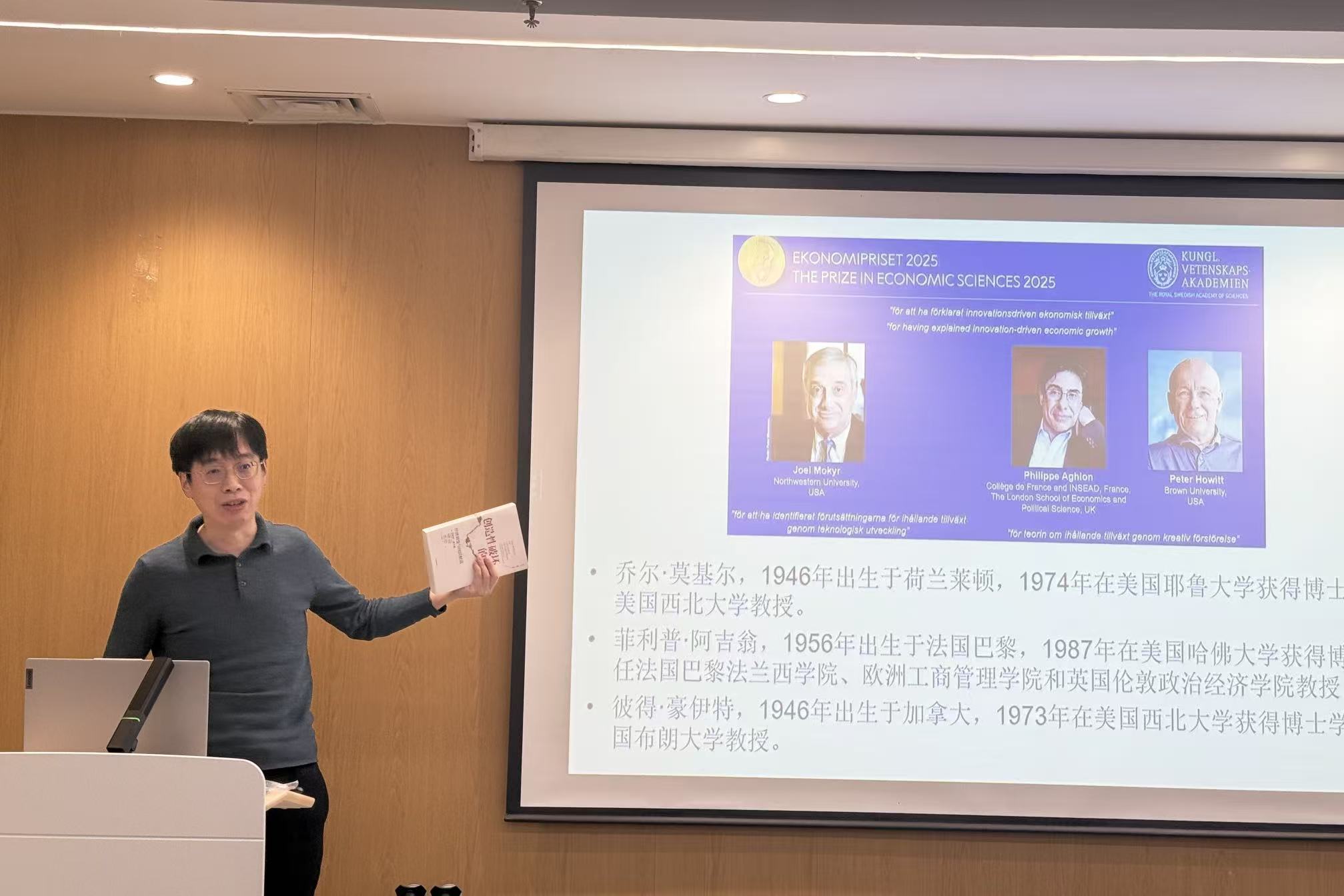 接着,周江华老师对本次图书活动的意义进行了肯定并阐述了选择分享《创造性破坏的力量》这一书籍的原因。他指出本书是2025年诺贝尔经济学奖获得者作品,对当今社会具有重要的引领性与风向标作用。周江华老师随后带领大家梳理了本书的理论背景,指出传统经济增长模型将无法解释的“残差”归为技术,而阿吉翁的研究则通过“内生增长理论”深入揭示了“创新”的具体机制,即本书的主旨。同学们积极踊跃地回答老师的问题,在巩固了相关专业知识的同时,对创造性破坏的力量有了更深入的了解和体会。周江华老师重点阐释了书中核心概念“创造性破坏”赖以发生的三大支柱:累积式创新、激励机制与产权保护,以及新旧产业与企业的更替。他还以“好学生与坏学生”的生动比喻来阐释竞争的双重效应:适度竞争能激励前沿企业创新,但过度竞争会挫伤落后企业,创新与竞争之间整体上呈现倒U型关系。最后,周江华老师联系数字时代的新变化,探讨了知识累积形式可能面临的转变,并总结了本书的政策启示:理想状态需要有效市场、有为政府与活跃的民间社会形成黄金三角,共同运用激励前沿突破与保障社会平稳转型的组合政策,方能驾驭创造性破坏的力量。同学们在与老师的互动中反思顿悟,并收获新的理解和思考方式。