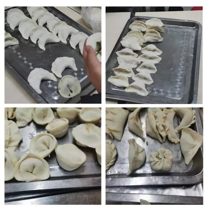 各地包饺子手法相当不同,这次出现在同学们面前的托盘里的饺子就包括了十分吉利的元宝饺子,精致的柳叶饺,比较常见的弯弯月牙饺,波浪饺,看起来相当复杂的钱包饺,脑洞大开的包子型饺,以及形容不出的随心所欲饺。