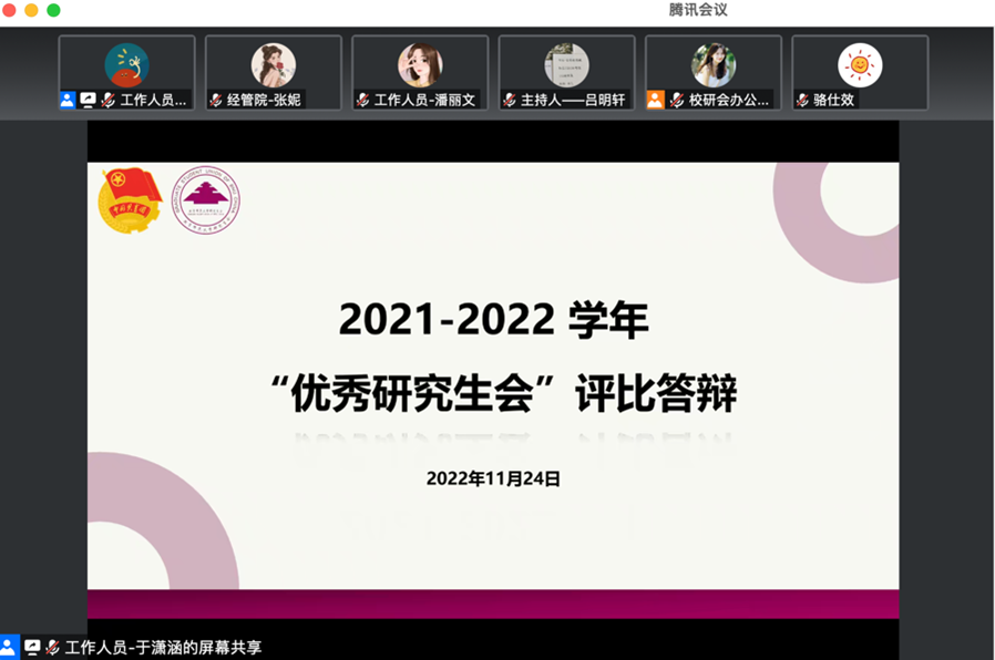 2022年11月24日晚7点, femboy 2021-2022学年“优秀研究生会”评选在线上举行。主席团成员张妮代表femboy 研究生会参与评选,按照抽签顺序,于第二个出场进行工作汇报。