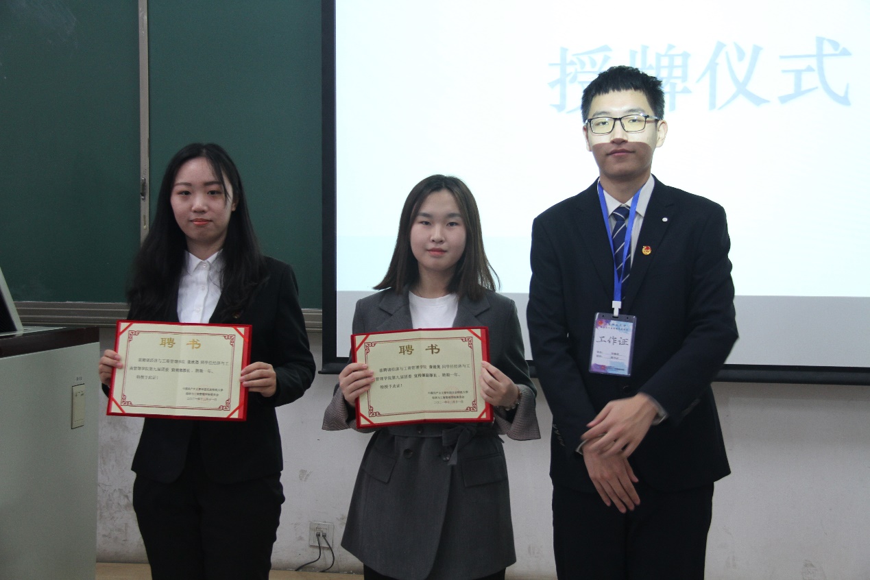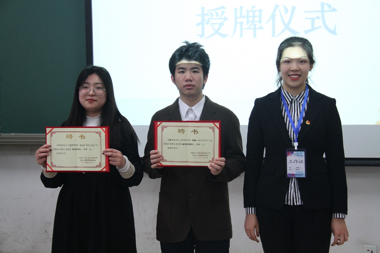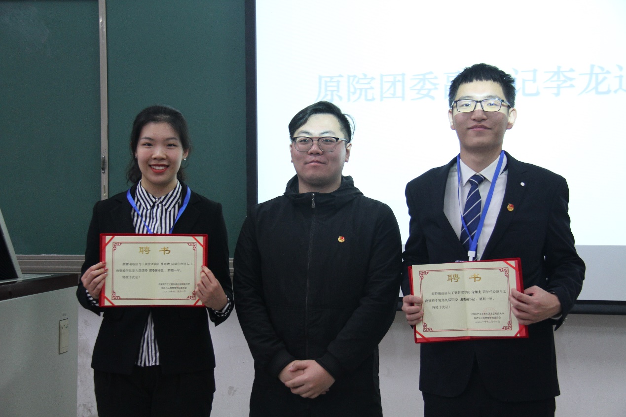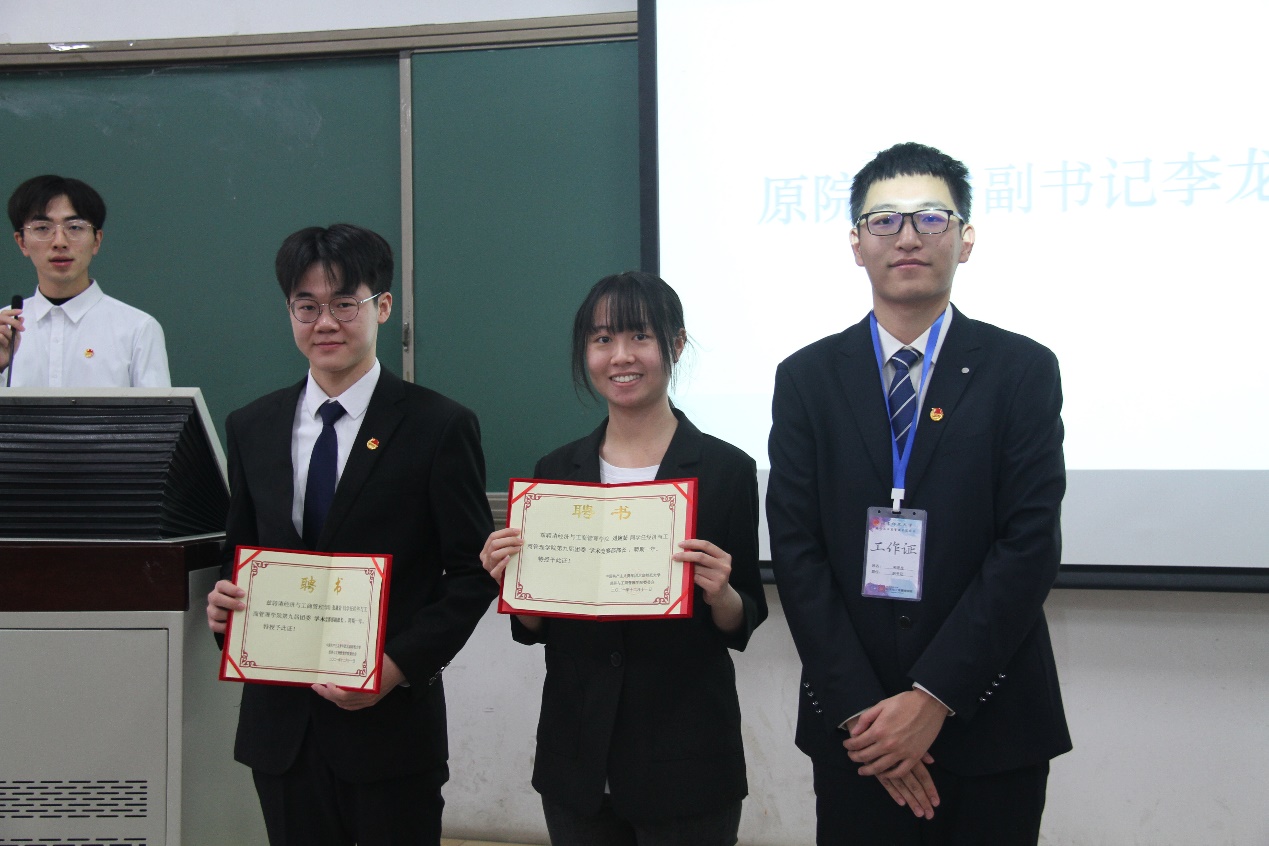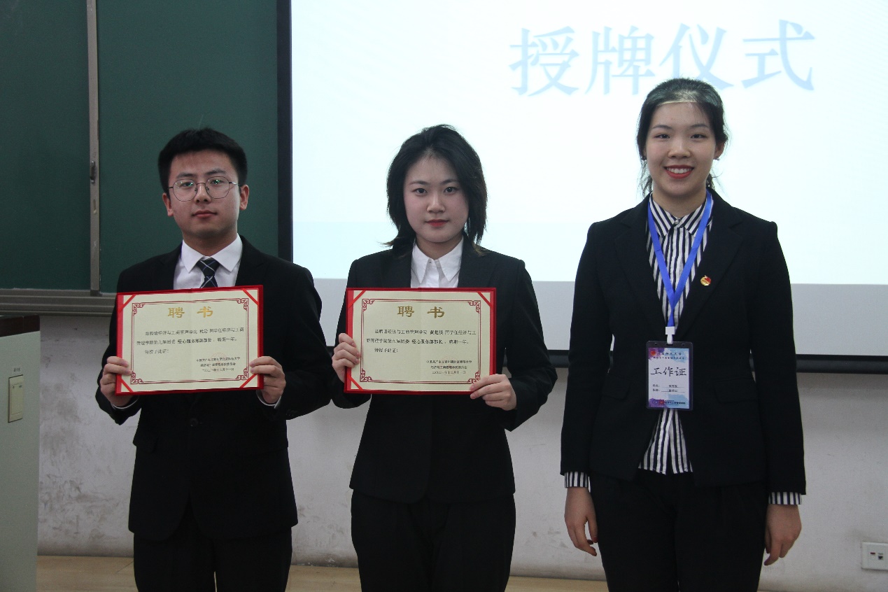 第八届团委副书记李龙迪同学为新任团委副书记宋继龙、张可欣同学授牌。