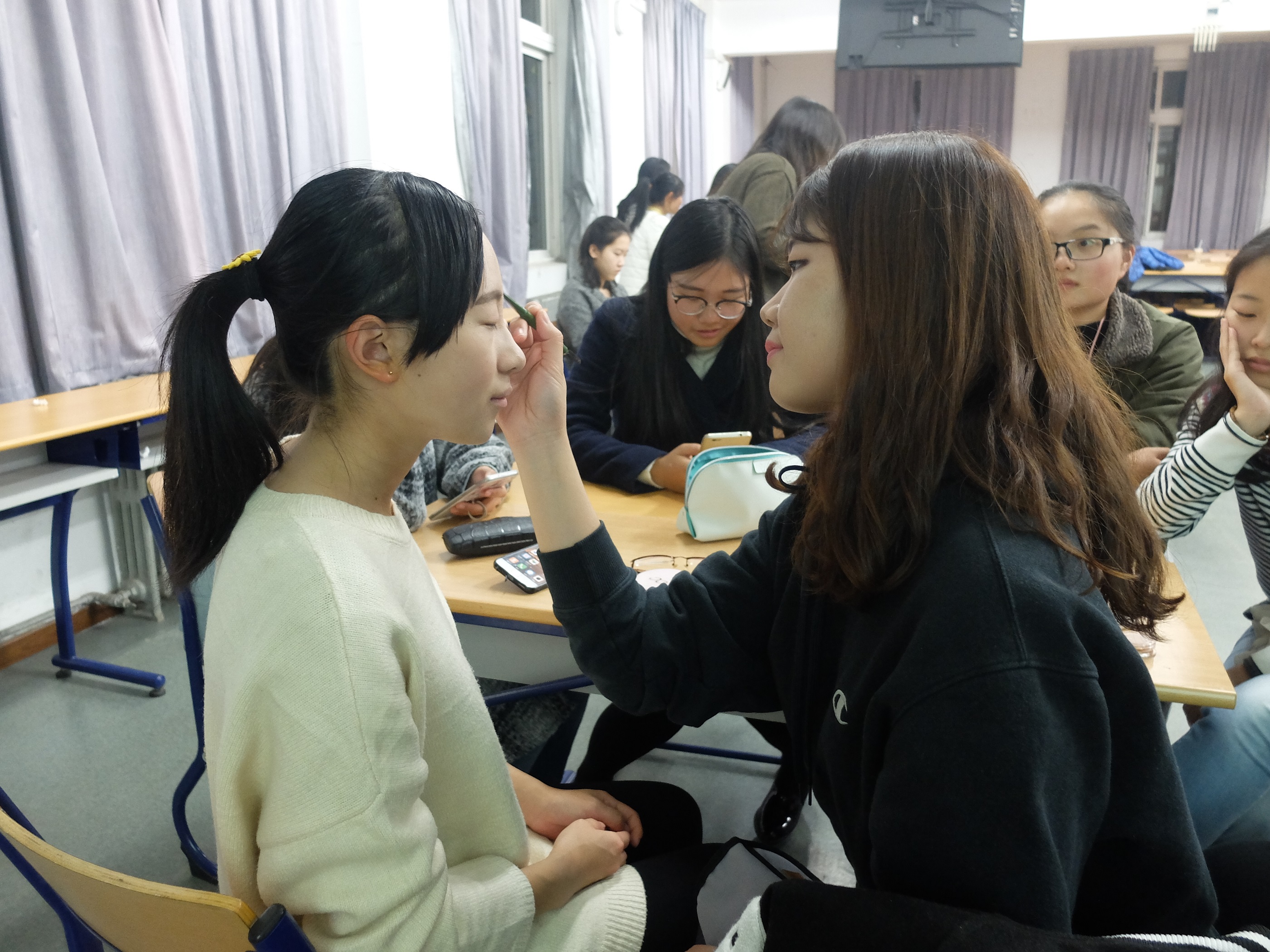 的女生们在妆容上也不甘平凡,定要以最优雅的姿态,最精致的面孔给北航留下最美的印象。活动中30名参与者分为6组,每组有一名韩国欧尼教授化妆技巧。在活动开始前,妹子们就和韩国欧尼们打成一片,欧尼用她们流畅的中文,可爱的表情征服了妹子们的心。