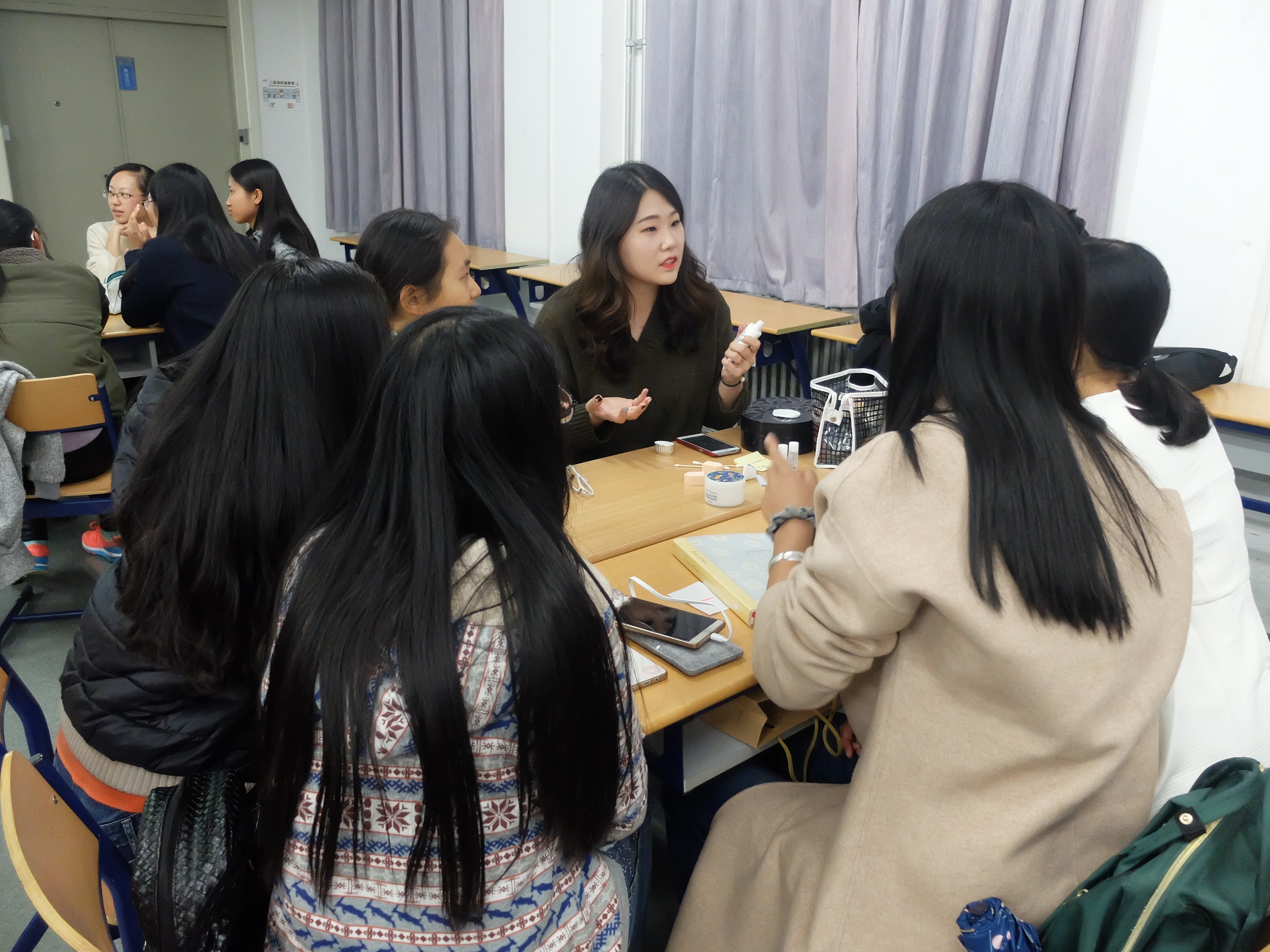 在教四201举行“冬日‘靓’妆大作战”化妆沙龙。本次活动有幸邀请到韩国留学生长腿欧尼手把手教学,并有30名爱美的经管妹子热情参与其中,在一片欢乐中get化妆技能。