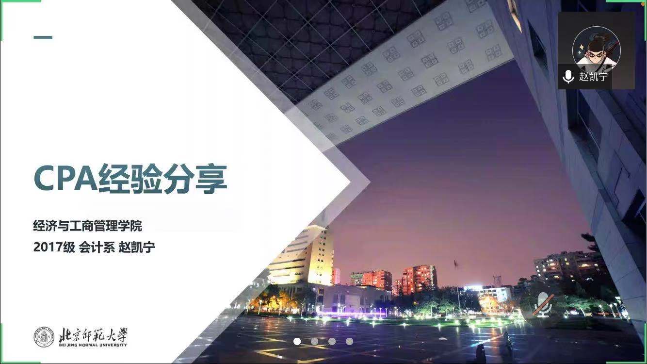 2021年4月24日,由北师大经管学院研究生会和学生会举办的CPA考试经验分享会以线上分享的形式顺利举办。本次讲座邀请到经管学院2017级会计学硕士研究生赵凯宁师姐,赵凯宁师姐读研期间在安永审计金融组、万科税务管理组、中信信托有过实习经历,现就职于维沃移动通信有限公司。院研会职发部赵加良主持了本次讲座。