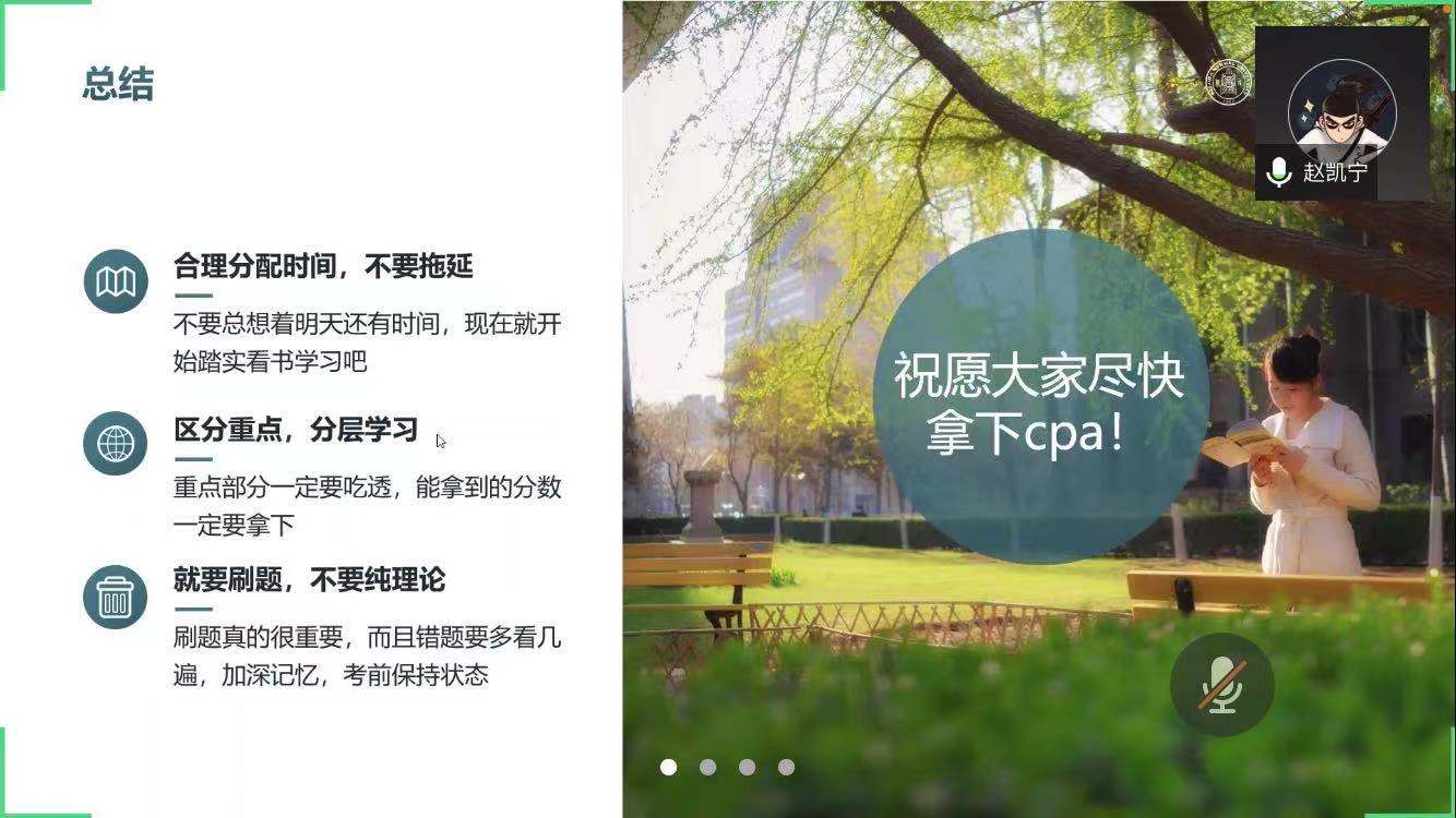 赵凯宁师姐本次的分享大致可以分为三个部分。首先,师姐给出了CPA考试科目的搭配建议。师姐建议大家最好在2-3年考完CPA考试,过长的战线容易学习疲劳,因此可以每年考两门或者三门;以后大家在工作中会用到很多理论知识,建议稳扎稳打,形成专业知识框架。
