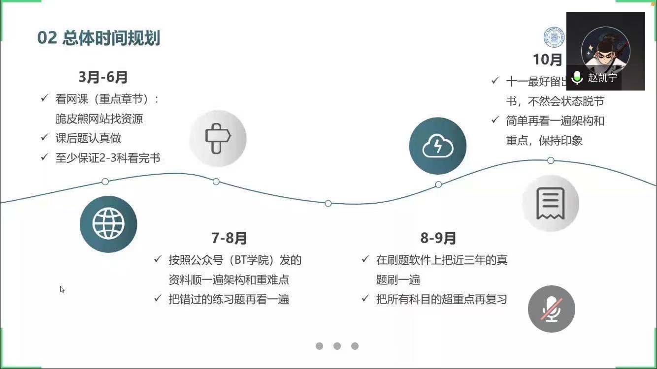 其次,赵凯宁师姐从自身备考经历出发,为同学们制定了总体的时间规划:3-6月应该将重点放在看网课上,7-8月侧重于框架的搭建与重难点的突破,9月的主要工作是刷真题。