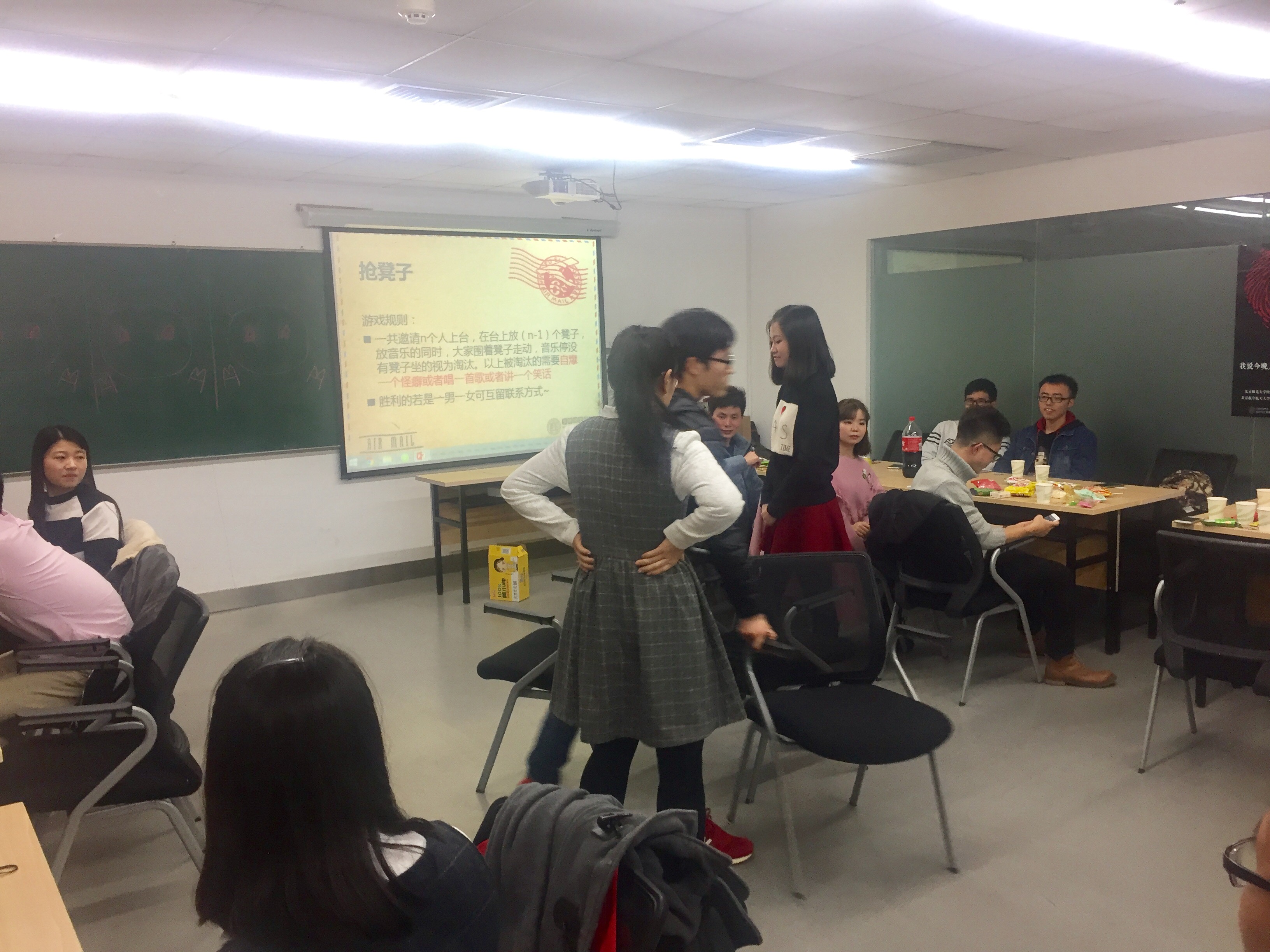 随后,又进行了“抢椅子”、“贴部位”、“你画我猜”和“盲人画猪”的游戏。贴部位比较有趣,从贴大腿到贴肩膀,再到最后的拥抱,场面越来越火爆;还有“盲人画猪”游戏,需要身材强壮的北航汉子先原地转5圈,然后再背着选择的女生到黑板的位置画猪的鼻子,有位男生转的晕了向,背着女生横冲直撞,最后只能像螃蟹一样横着向前走,引起了阵阵爆笑。