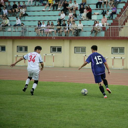 当天,天色渐晚,在学校东操体育场内,身穿白色队服由左往右攻的是经生联队,数化统天联队则身着经典的切尔西蓝。随着主裁判一声哨响,经生联队率先开球,开球后经生联队牢牢掌握着控球权。比赛第4分钟,坦桑尼亚前锋Duwe在前场得球,一脚劲射球擦着球门边网飞出。经生联队一直将数化统天联队压制在对方半场内,第十分钟,数化统天联队觅得防守反击得绝佳机会,对方15号前锋凭借速度摆脱我方防守球员,但其单刀被经生联队门将宁平轻松化解。大约第15分钟,核心中场许辉接边锋刘刚传球,拔脚便向球门怒射,对方门将扑球脱手,Duwe紧跟着一脚贴地斩补射,球擦着边进入了球门,Duwe为经生联队拔得头筹!此后,双方你来我往,一直到中场结束均未形成较好的机会。