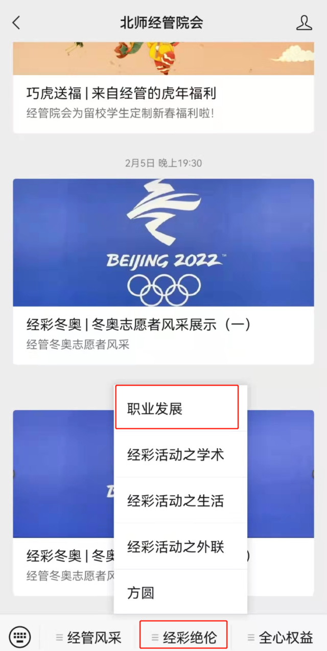 为了方便同学们查找职业发展方面的信息,北师经管院会公众号在“经彩绝伦”内将特设一个“职业发展”版块,收集四大宝藏内容,让每一个关注职业发展规划的同学不再迷路!