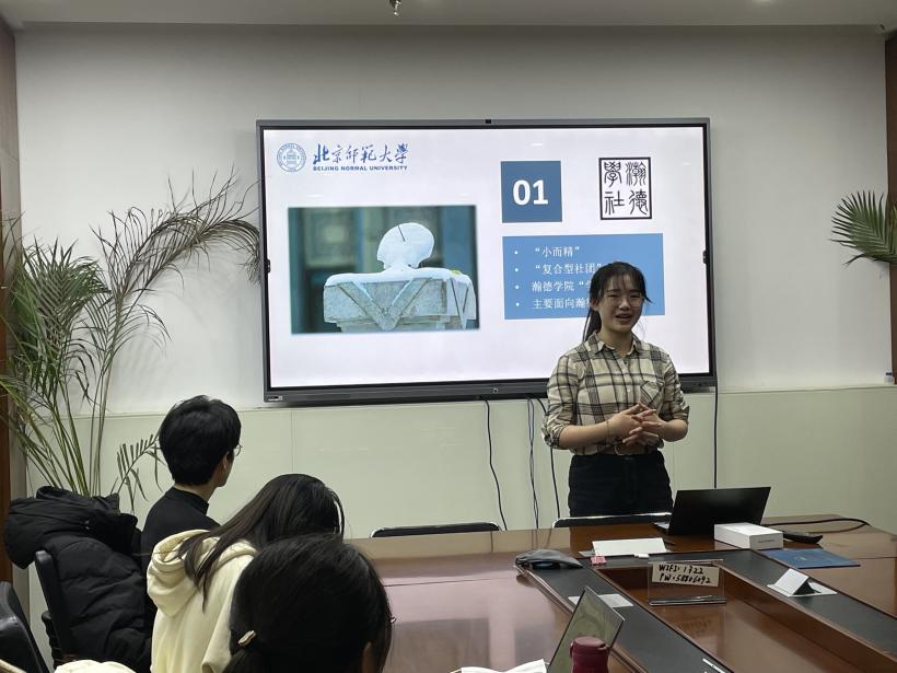 瀚德学社社长罗淇文对社团基本情况和社团活动做出介绍,提出反思与总结,并对未来活动做出计划。罗淇文社长介绍了瀚德学社现如今的社团规模和定位,并对“瀚德读书会”的筹备、换届交接、秋季招新、外教满意度反馈、校友回访和线下茶话会等活动开展情况做出说明。然后对人数、分工问题和新媒体运营等方面提出不足与反思,并决心延承优势,改变不足。