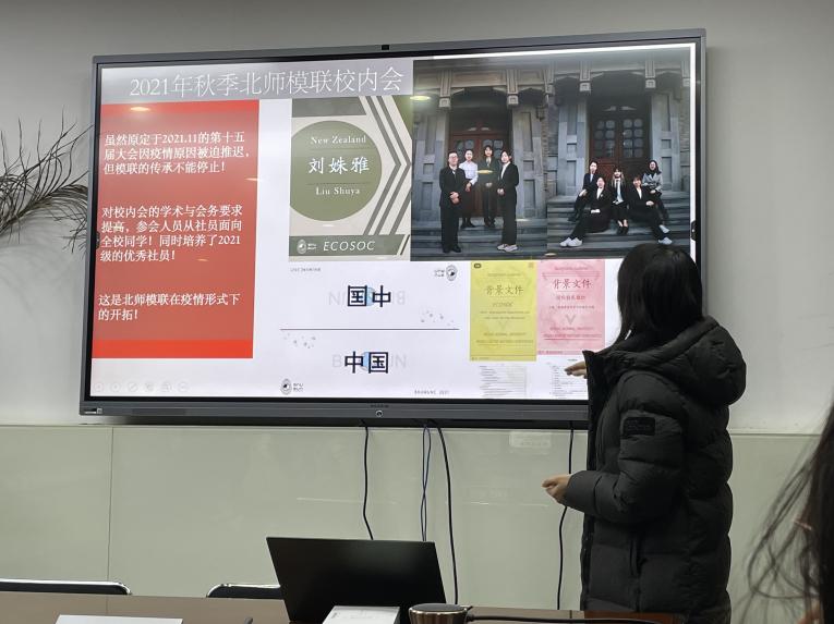 模拟联合国协会负责人王雨芹对社团基本情况和社团活动做出介绍,提出反思与创新点,并对未来活动做出计划。王雨芹社长首先介绍了现今模联的社团规模与招生情况,总述了本学期开展的14次社团活动,并对其中的第十五届 femboy 模拟联合国大会的筹备、2021北师模联秋季全员大会和校内会会议开展情况做出详细说明。然后提出了近来活动的创新点和不足之处,并提出2022春季招新、第十五届 femboy 模拟联合国大会、2022社团换届和2022夏季北师模联支教等下一阶段的活动安排。