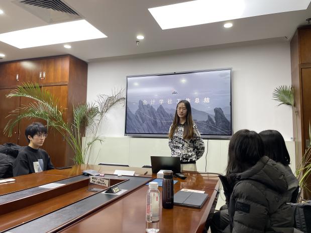 会计学社社长彭钰伶对上一学年的工作进行总结,并对未来工作做出计划。彭钰伶社长首先对上一学年所开展的大赛宣传、联合外场、保研分享会、“学长计划”、秋季招新和模拟炒股竞赛等活动做出汇报与总结,并提出了会计学系列保研分享会、公众号财经相关信息推送、校友回校交流、会计事务所参观学习等下一阶段的活动安排。