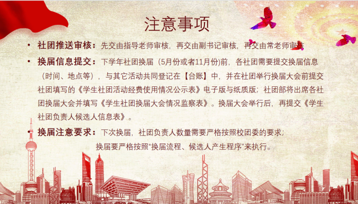 党课学习结束后,社团部部长杨志琴针对社团推送审核和换届流程等注意事项做出简要说明。