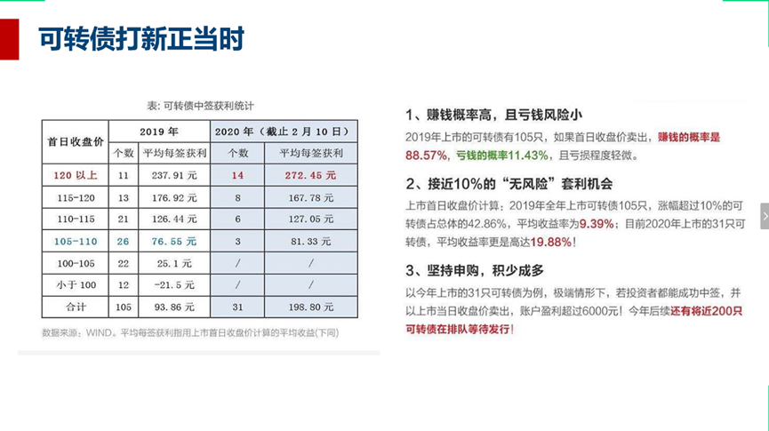 第二种是可转债:可转债本质是一种债券,但在一定条件下转换成股票,有着“下有保底,上不封顶”的特点:在“债”的属性上,可转债能够知道涨多少,知道跌多少,知道持有多长,亏钱风险小;在“股”的属性上,赚钱概率高。