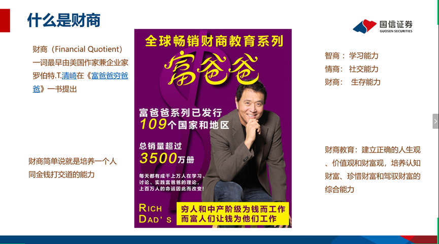 财商一词最早由美国作家兼企业家罗伯特·T·清崎在《富爸爸穷爸爸》一书中提出,简单说就是培养一个人同金钱打交道的能力,它不仅仅是理念的传达,更重要的是与实践结合。财商有两个核心概念: