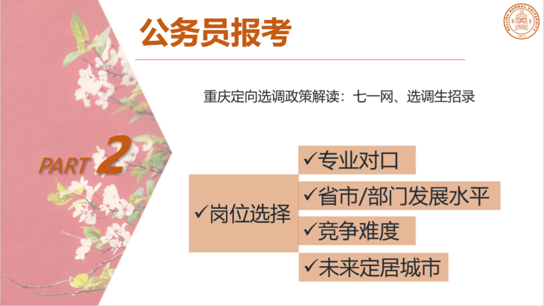 在公务员报考方面,刘星辰师姐介绍了地方省考和地方选调的报考条件,并建议同学们要熟读当地的政府工作报告,了解周边省市区县的情况。在岗位选择上,刘星辰师姐建议从专业、地区发展、竞争难度等角度考虑,选择适合自己的岗位。