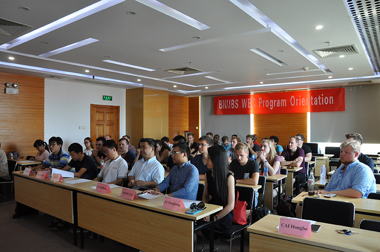 赖德胜院长首先对所有同学表示欢迎,而后简要介绍了学院情况,他勉励大家珍惜时光、勤奋学习并祝愿同学们在北京生活愉快。而后,郭垍副教授作为任课教师代表介绍了其所教授的两门课程并表示对来自世界各地的新一届同学充满期待。接下来,16级WEC新生代表Christian Streil(卢森堡)以及15级WEC学生代表Robbie Peeters(荷兰)上台发言。Christian同学对即将进入WEC项目学习十分期待,他希望在这里获得学习、生活等各个方面很大的提高。Robbie同学总结了自己过去一年的学习、生活方面的感受,他将北师大描述为“家”并建议同学多与授课教师进行沟通并主动和同学们交朋友。最后,WEC项目班主任刘书秀老师详细介绍了北师大经管学院、WEC项目,以及通过新生导引帮助同学们如何面对文化差异以更好的融入新的环境。