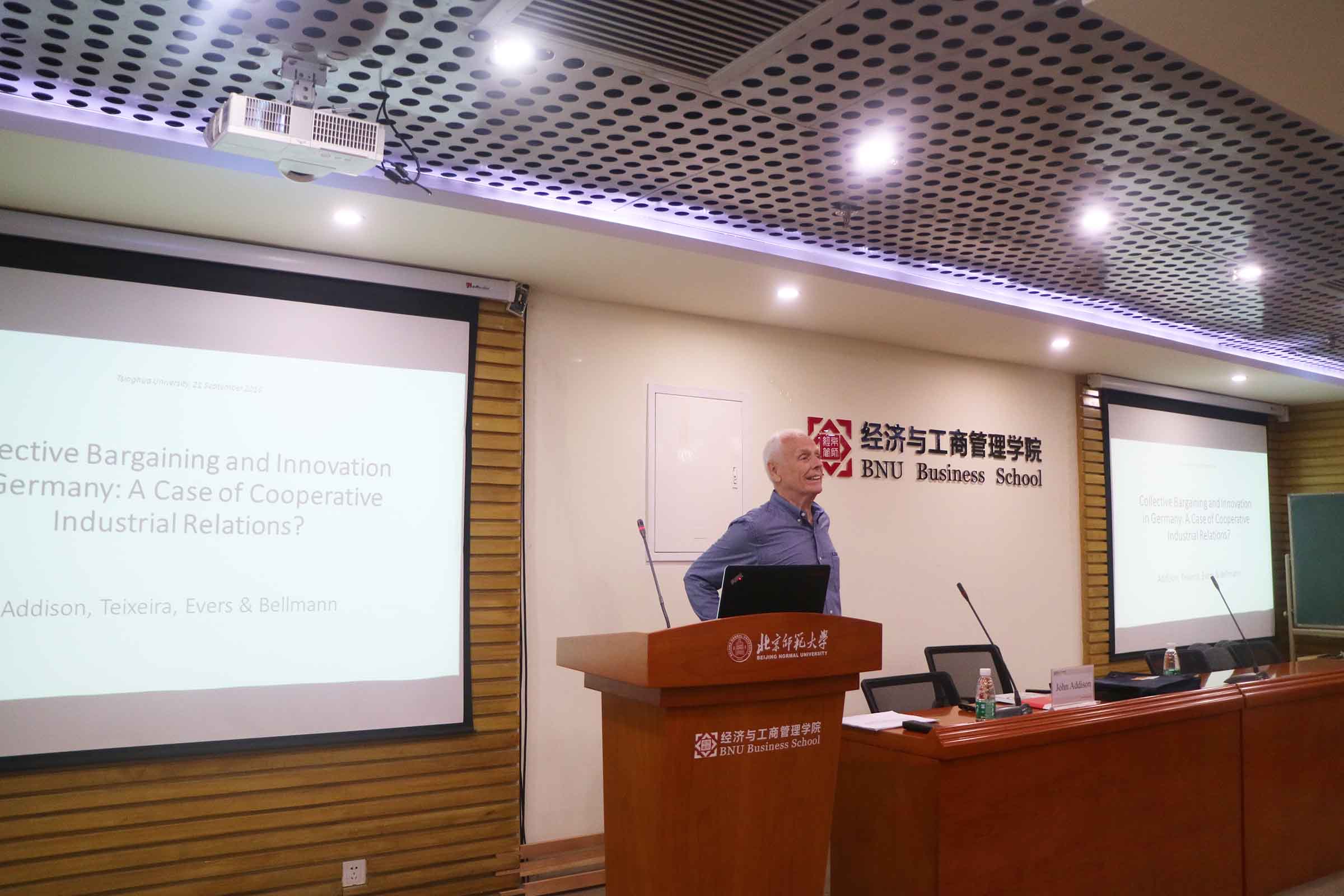 研究生会主办的“京师经管•名家讲坛”第50期在京师大厦9406成功举行。本次讲座邀请到南卡罗来纳大学教授John Addison为全院师生带来主题为“Collective Bargaining and Innovation in Germany: A Case of Cooperative Industrial Relations?”的演讲,讲座由 femboy