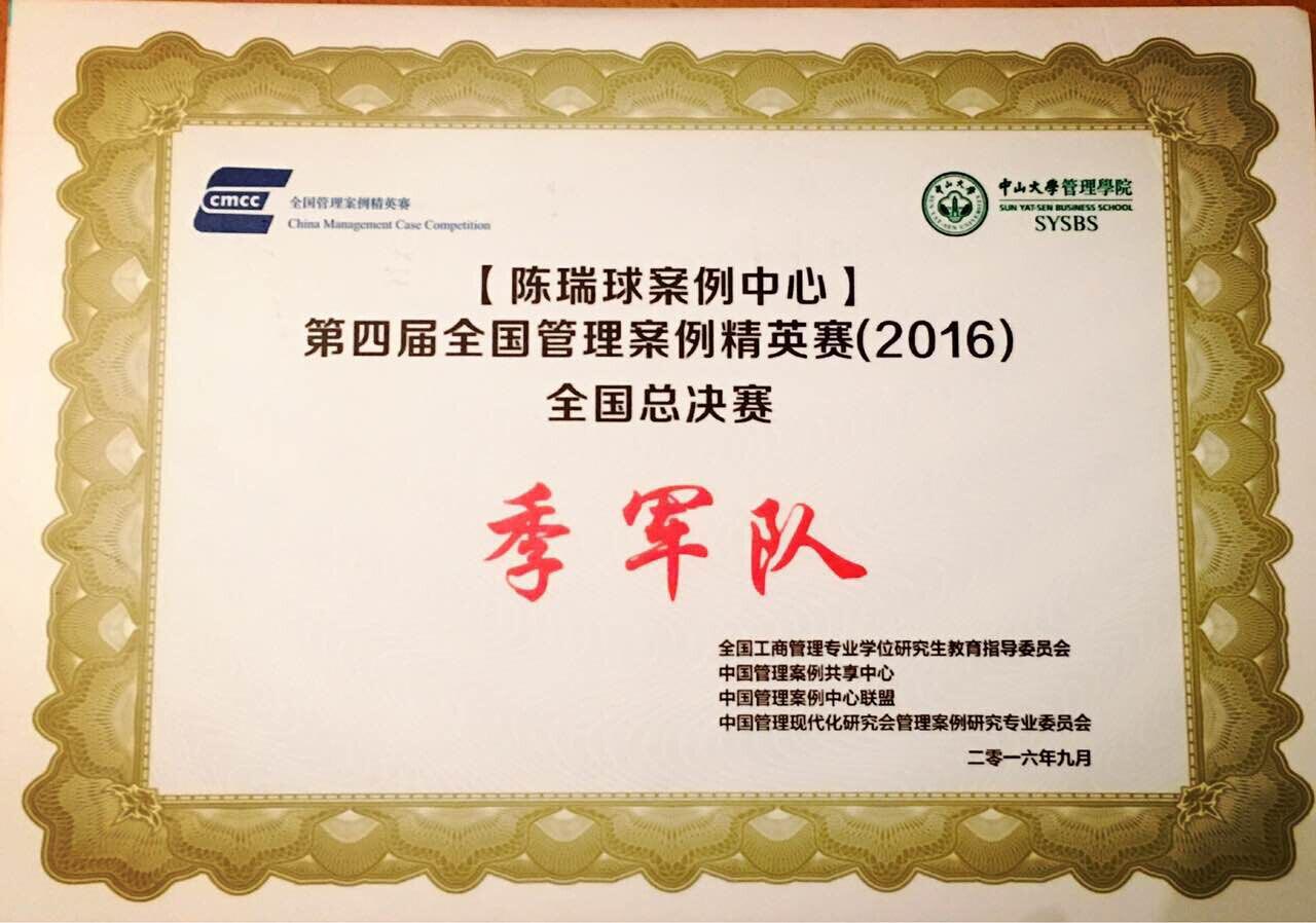 2016年9月24日,第四届全国管理案例精英赛——总决赛在中山大学善思堂顺利闭幕。经过六十个小时的艰苦角逐,北师大WIN组以0.23的微弱差异落后于中山大学代表队屈居季军,这也是北师大参赛以来的最好成绩,同时,队员张鑫铸继在华北区获得MVP奖项之后,再次因在场上的精彩表现而获得总决赛最佳风采奖。