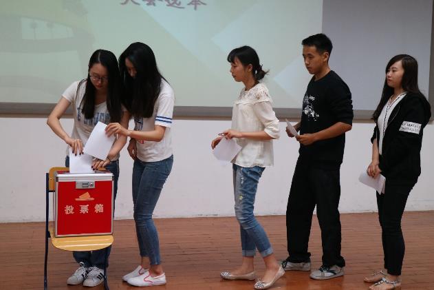 与会代表举手表决通过了大会选举方法和监票人名单后,竞选正式开始。分团委副书记候选人14级经济学李京儒、14级金融学陈家华、14级会计学袁博分别做了竞选演讲。随后学生会主席候选人14级会计学李诗怡、14级金融学苏泓玮、14级经济学杨季枫、14级会计学高宇飞、14级金融学黄力维也纷纷登台。接下来,提问环节,各候选人回答巧妙,赢得阵阵掌声。