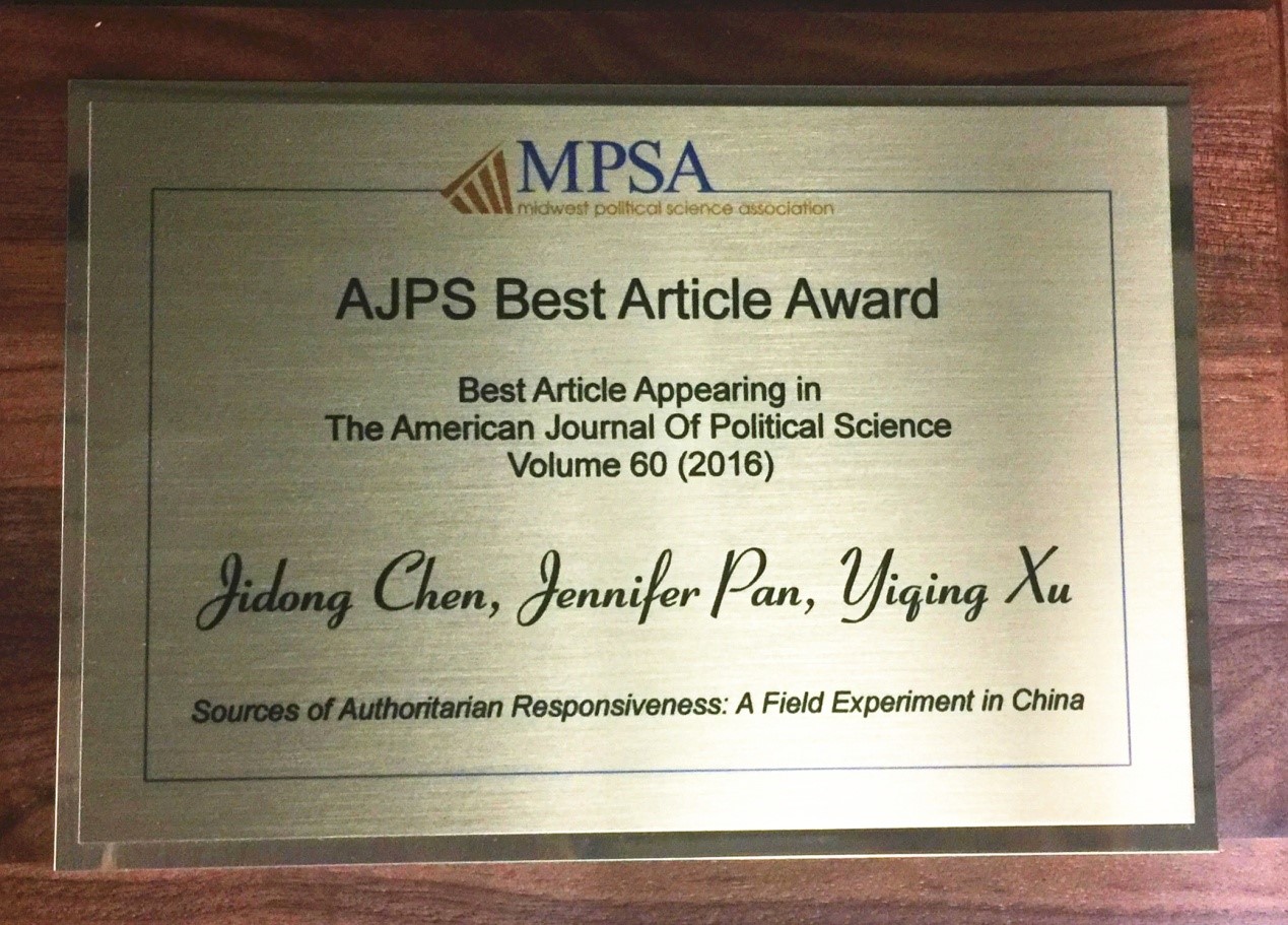 青年教师陈济冬的合作论文《Sources of Authoritarian Responsiveness: A Field Experiment in China》(与Jennifer Pan和徐轶青合作)获评国际顶级期刊《American Journal of Political Science》(美国政治科学杂志)2016年度最佳论文奖。该论文研究了中国地方政府对居民经济福利诉求的回应度及其激励机制。
