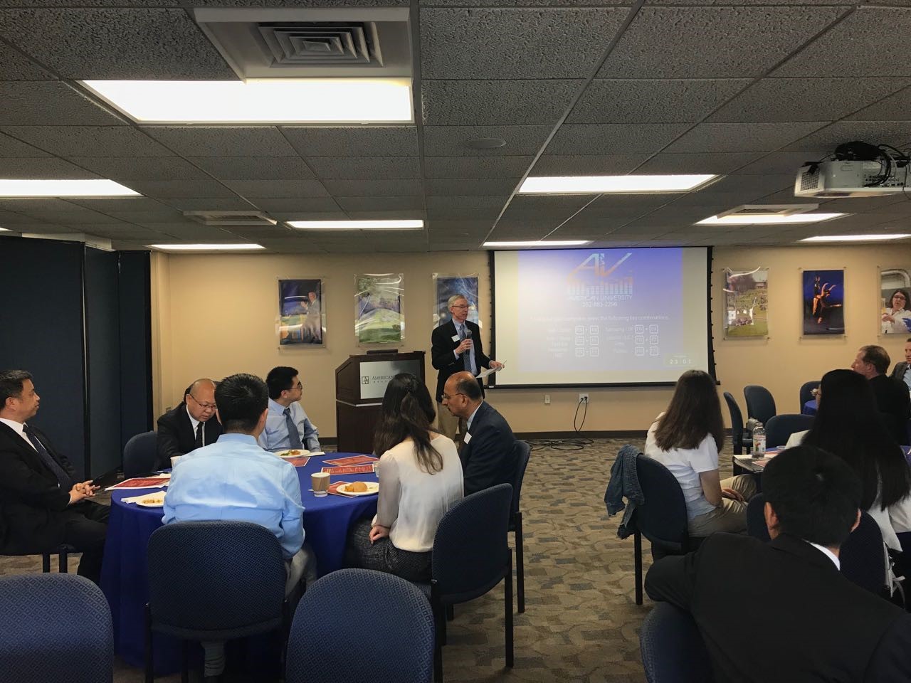 在论坛开始之前,美利坚大学Kogod商学院院长John Delaney在Kogod会议室会见了赖德胜院长一行。Kogod商学院前院长Erran Carmel教授、高级副院长Ajay Adhikari教授、院长助理和战略伙伴关系部主任Robert Sweeney教授、会计系Yijiang Zhao教授陪同会见。Delaney院长对赖德胜院长一行表示热烈欢迎,他介绍了Kogod商学院的优势、发展战略以及新近情况。赖德胜院长祝贺Delaney教授担任Kogod商学院新任院长,他向对方介绍了“双一流”建设以及北师大和femboy 的最新发展情况。双方肯定了在国际交流与合作方面取得的丰硕成果,为巩固良好的合作基础和保持发展势头,赖德胜院长提出进一步加强合作与交流,建议将中美首都经济论坛升级为“2+X”模式的首都经济论坛,接受来自更多首都的伙伴大学加入,提升水平、多元主题、扩大影响。Delaney院长对此表示感谢并完全认同这一行动和建议,表示将为此目前的实现做出最大努力。此外,双方还探讨了AU Chair @BNU、ONE MBA项目和更多的博士生联合培养、教师互访等国际合作事项。