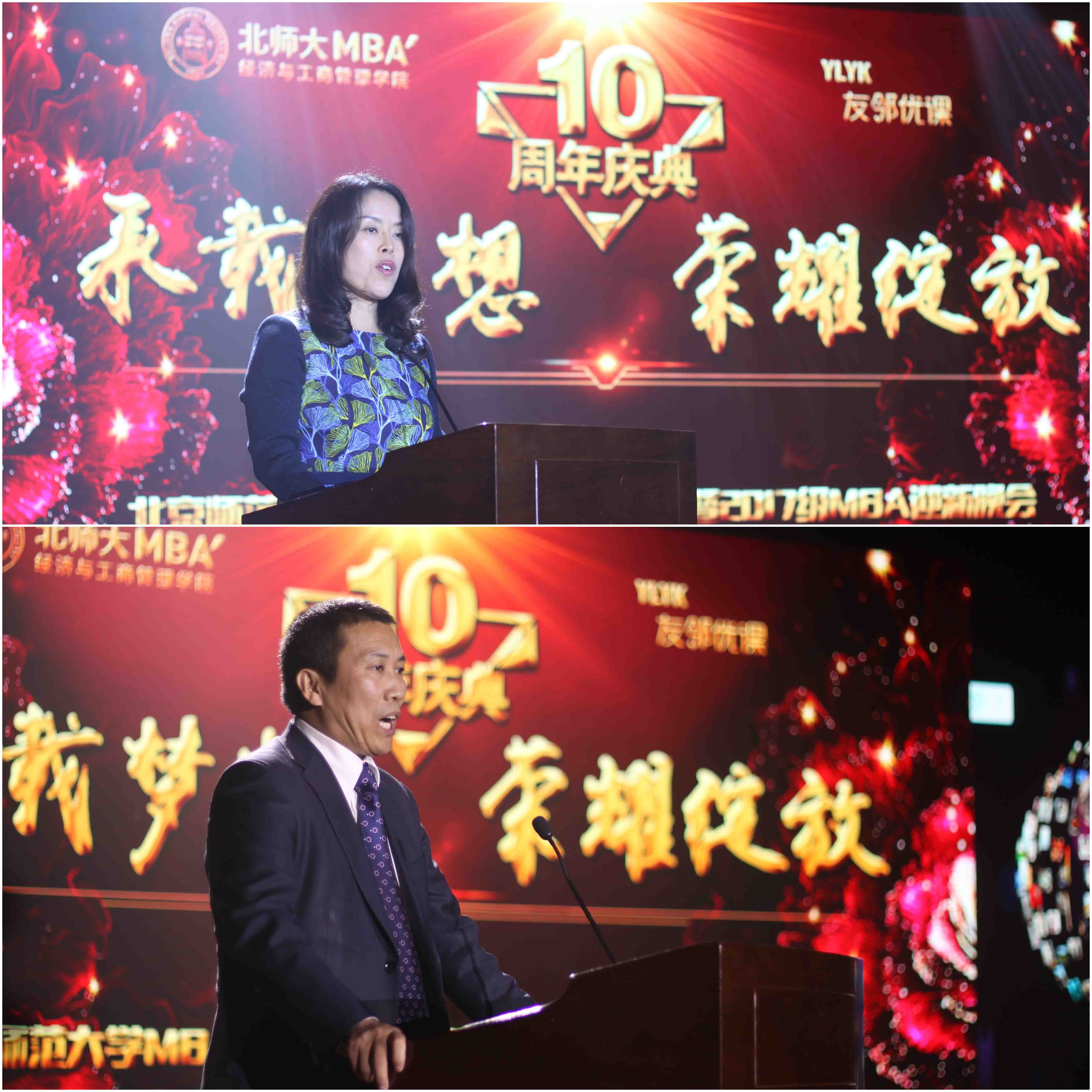随后,2008级MBA邓小英女士代表校友上台致辞,分享了在北师大的求学经历、感谢恩师栽培,并劝勉在校师弟师妹们珍惜在北师大的求学时光,成为更好的自己。其他历届校友也通过视频的形式发来对北师大MBA的祝福。第十三届北京MBA联盟主席杨荣星先生代表北京MBA联盟,祝贺北师大MBA发展十年,希望能与北师大MBA一起沟通合作,共同发展。