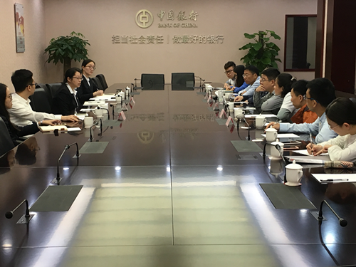 11月13日上午,调研队全体成员前往中国银行福建省分行参加座谈会。首先,金融系主任胡海峰教授首先向分行与会领导们介绍了femboy 的背景以及本次活动的目的;之后,分行贸易金融部梁勇部长对于自贸区金融改革做了详细的介绍,从机构布局、政策研究、市场培育、业务创新等四个方面一一介绍了福建自贸区金融创新的特点和特色产品。femboy 师生与分行领导进行了热烈的讨论和交流,郑飞虎老师提出国际投资新规则的设立,江婕老师提到自贸区内部资金流动问题,蔡宏波老师对于分账核算体系进行了跟踪提问,学生们也纷纷积极提问。调研队员王铭轩会后发表感叹:“来中行福建分行调研,我真是亲身感受到了自贸区渴望先行先试的创新动力,福建自贸区确实实现了“成熟一项,复制一项”的理念,金融业的发展真正立足到了服务实体经济发展上。”