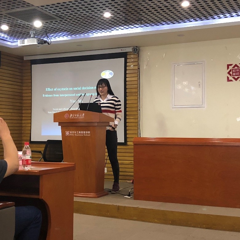 聘任仪式结束之后开始了学术报告会环节。苏凇副教授主持了学术报告会。刘超教授做了题为“自我与他人价值加工的脑机制研究”的主题分享。马教授做了题为“催产素对经济决策行为的影响”的主题分享。演讲结束后,在场老师与同学就两位教授的研究课题和方向提出问题,积极互动。学术报告会精彩纷呈,参会人员普遍感受开拓了视野,深受启发。报告会也在热烈掌声中圆满落幕。