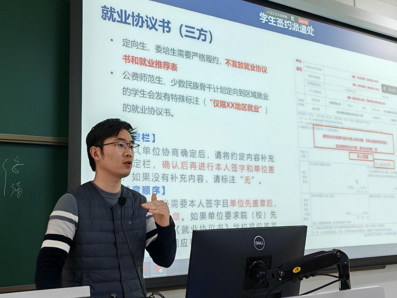 李论老师作就业政策解读。他详细地为同学们介绍了我国部分城市人才引进政策以及主要的政策性项目,以及三支一扶、特岗教师、志愿服务西部计划、大学生参军入伍、国际组织实习项目、科研行政助理、保研等其他政策性项目。此外,他对就业推荐表、就业协议书、户档转迁、改派手续等毕业生常见的就业问题进行了详细解答,并介绍了就业派遣系统填报的操作指南与注意事项。