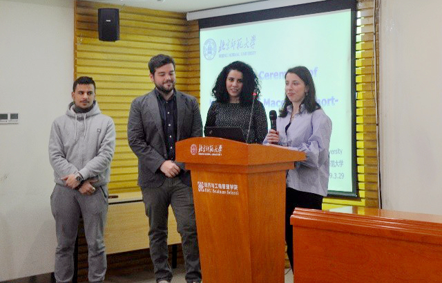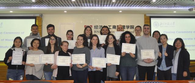 首先,李婧雅老师充分肯定了同学们两周以来的学习成果和各个方面的收获,也对本次项目辛勤付出的老师和同学们表示感谢。紧接着,由4位学员代表用流利的中文向大家做了项目心得的分享,大家表示通过北师大经管学院提供的商务与经济课程、中国传统文化体验(剪纸、书法、国画)、商务中文以及企业参访(全聚德、北京高校大学生创业园区)等,更加了解了中国目前的经济与商业环境及中国传统文化的博大精深,也对目前大学生创业项目产生了浓厚的兴趣。