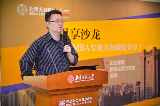 伍燕然老师详细介绍了金融专业方向的情况。他结合学院金融系、经济系、会计系等优势学科,强调了要培养学生的人文精神和创新精神,具备全球视野和战略眼光;同时介绍了金融行业学生在银行、券商、基金、信托等领域的发展前景;重点讲述了就读金融MBA的优势,适读人群的特质;最后展示了北师大MBA金融方向的优质师资力量。