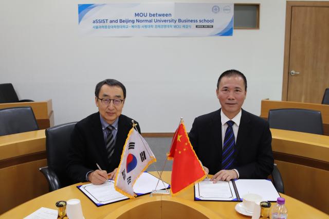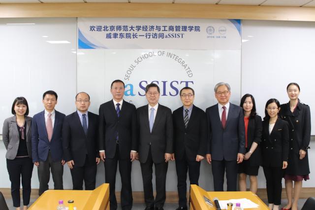 10月17日,戚聿东院长一行访问首尔综合科学技术大学院(aSSIST),并与该校校长Tae Hyun Kim举行会谈。aSSIST副校长Yong Joo Choi、aSSIST讲席教授文辉昌教授、aSSIST学术院长Bo-Yong Kim、黄菲教授、尹文艳教授等参加会见。双方就师资互访、合作博士学位项目等工作商谈了意向和计划。随后,戚聿东院长与Yong Joo Choi副校长签署了合作协议(MoU)。