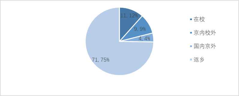 截止到2020年2月,经管学院拥有95位在读留学生。疫情发生之初,正值学校2019年秋季学期末尾,学院30余位秋季学期来院交换生刚刚离境,95位在读留学生中有11位学生留校,9位租住在校外,4位在国内京外,71位返回母国(图3)。疫情发生后,1月27日学校发文对所有学生进行摸排,将疫情通知到每位学生。同日,面向北师大全体师生的中英文版疫情防控通上线,每位留学生同中国学生一样进行每日情况上报。此项工作启动之初,学院就成立留学生管理临时工作小组,由学院主管国际交流与合作的副院长为小组组长,国际交流与合作办公室主任负责汇总、统计留学生班主任、交换生主管等提交的信息,并完成留学生每日情况上报。留学生班主任负责与每位留学生联络。由于留学生在学期末就各自安排出行,到疫情发生后,学生已分布在世界各地,班主任与留学生的联系方式主要是电话、邮件和微信。在工作小组的努力下,学院与95%的留学生取得了联系,通报了国内的疫情和学校暂不允许学生返校的要求,学生每日填报的比例也达到了93%(2020年2月15日)。疫情防控填报系统帮助学校和学院实时掌握学生的情况,对于填报身体有恙或有发烧情况的学生,班主任都进行了一对一的联系,要求学生及早关注,及早就医。在此期间,学院有两位留学生从京外游玩返京,两位学生被统一安排至北师大昌平校区进行为期14天的隔离观察,目前已结束观察,返回主校区。随着疫情的发展,2020年2月11日,北师大再次发文,要求所有学生不得返校,在校的学生尽量留在宿舍,对校园进行封闭式管理。2020年2月13日,根据教育部和北京市教委的要求,学校明确延迟开学日期,实施线上教学,行政线上办公。据此,学院再次要求全体留学生对已购买的返京机票进行改期或退票处理,视疫情情况对开学日期另行通知。