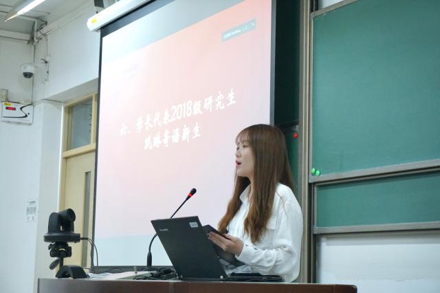 本科生学生会主席席梅芬作为老生代表进行发言。她分别从“勇于尝试,突破自我”、“珍惜当下,学会自律”、“肩负责任,牢记使命”这三个方面与本科新生分享了自己大学生活的心得与感悟。此外,她祝愿新生们能在四年的学习中收获独立思辨的思考能力,经邦济世的人文情怀,以及敢想敢干的拼搏精神。