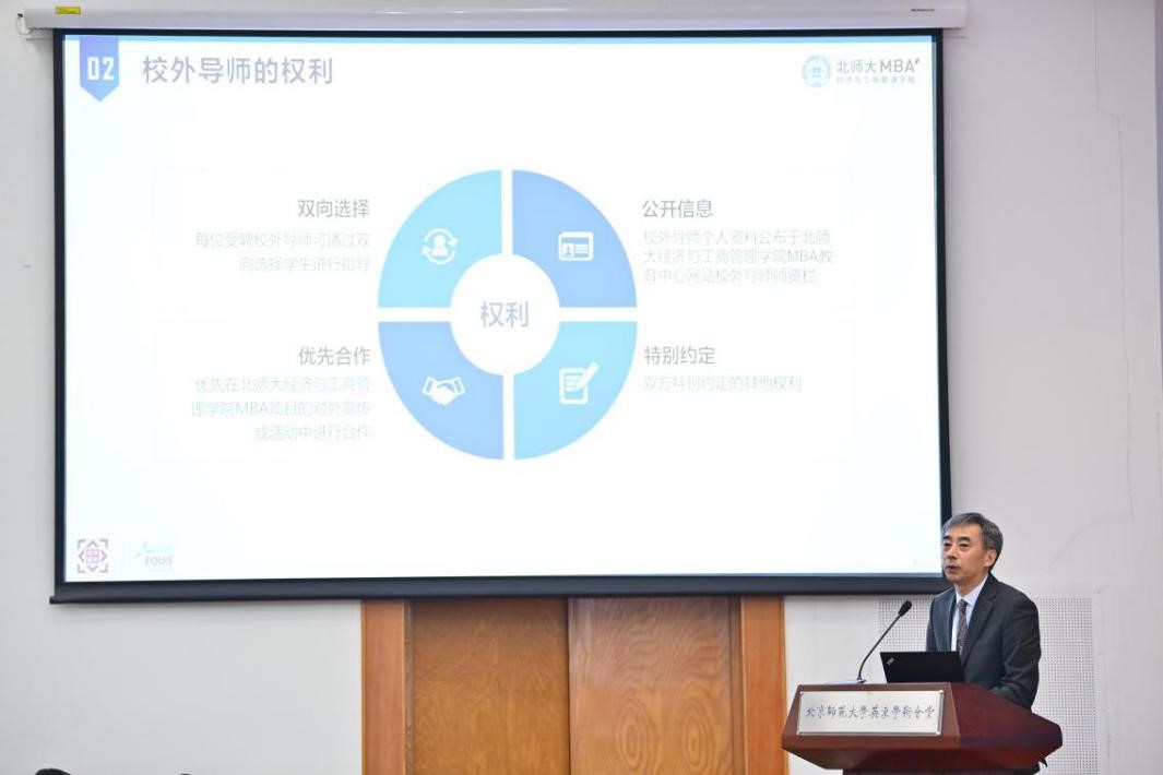 MBA教育中心主任孙川介绍了MBA校外导师职责与履职要求。北师大MBA校外导师聘期为两年,通过双向选择确定校外导师与学生的指导关系,严格按照导师守则进行学业指导。校外导师需要遵守校规校纪和师德师风,对每位学生的指导每年至少10小时,并且组织不少于一次的面对面活动。在履行基本指导职责的同时,鼓励校外导师参与高水平产教融合平台打造、实习基地建设、管理项目联合研发、人力资源合作、公益活动等方面。北师大MBA也将为导师提供交流分享平台和互惠机制,共同开发企业课堂,实现校企双赢。