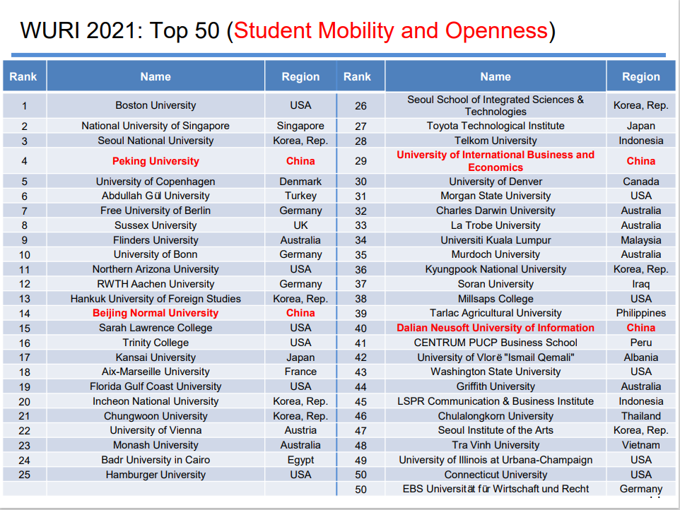 图4:2021WURI(创新大学)“学生交流与开放”分项评估全球50强排名