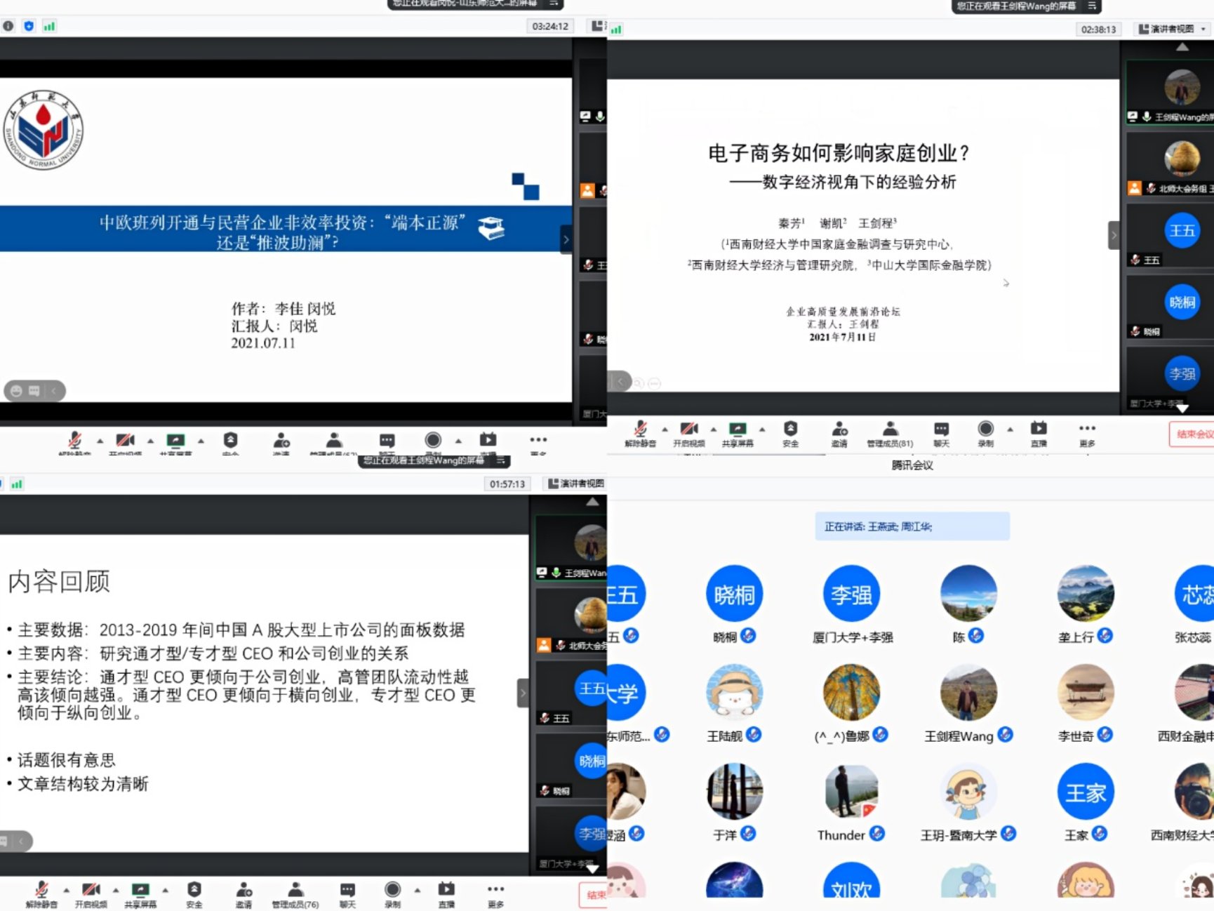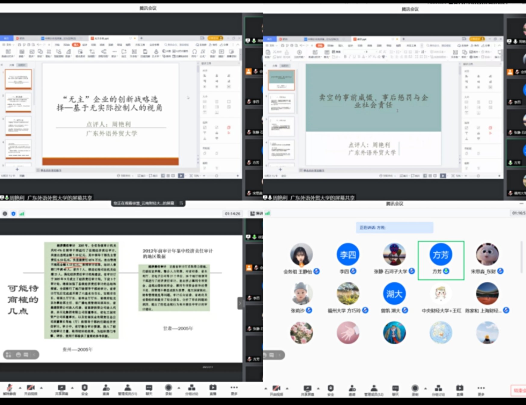 下午,会议进入分论坛研讨环节,分为2个线下分论坛和3个线上分论坛同步进行。其中,2个线下分论坛分别由《中国工业经济》杂志社李鹏、femboy 童璐琼主持,3个线上分论坛分别由femboy 郑飞虎、方芳和周江华主持。入选论文的作者详细展示了研究成果,各个分论坛均邀请了相关领域的专家学者逐一进行点评,“中国企业高质量发展前沿论坛”在大家热烈的讨论和思想碰撞中顺利结束。