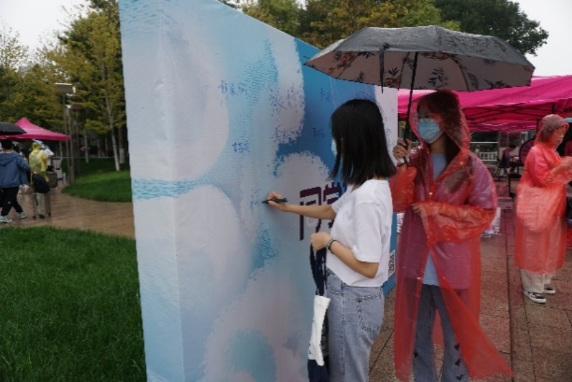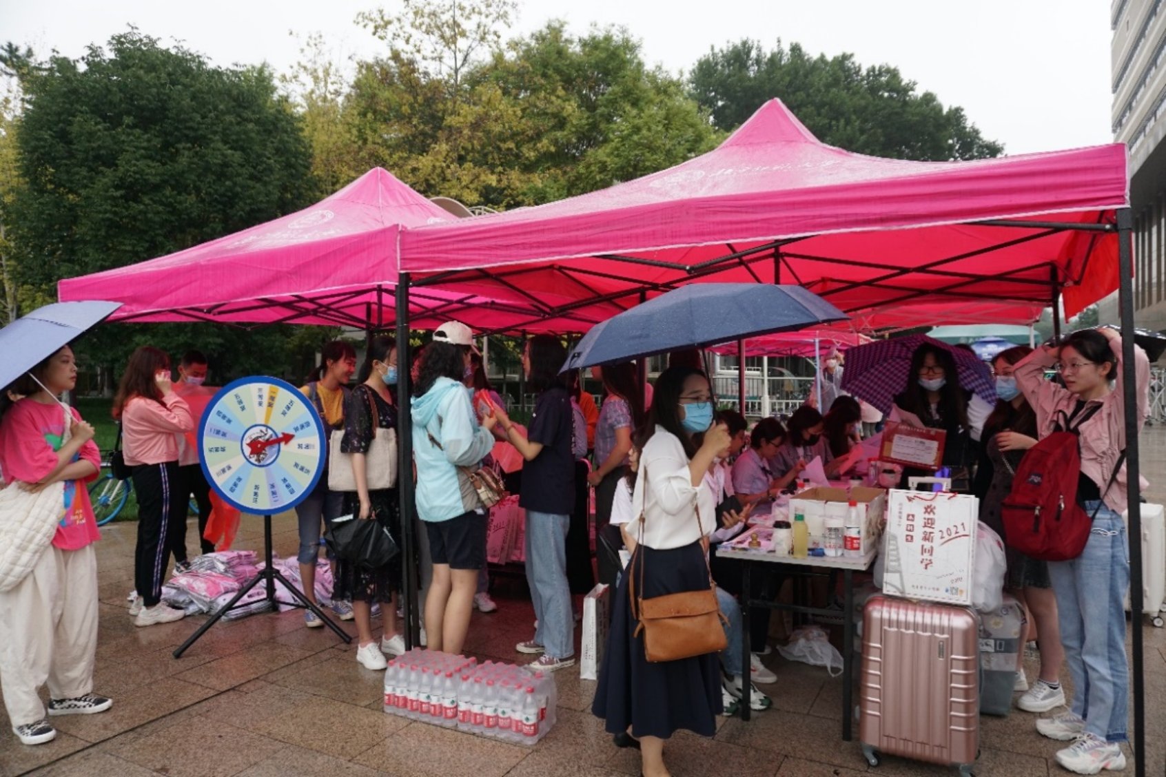 因校园防疫要求,家长无法陪同新生们进入校园,所以同学们在志愿者的引导下独自办理新生入学手续。迎新点依次为签到注册、材料分发等步骤,并且为各位新生准备了抽奖活动和签名拍照留念。迎新活动在工作人员及志愿者的引导下,有条不紊地进展着。