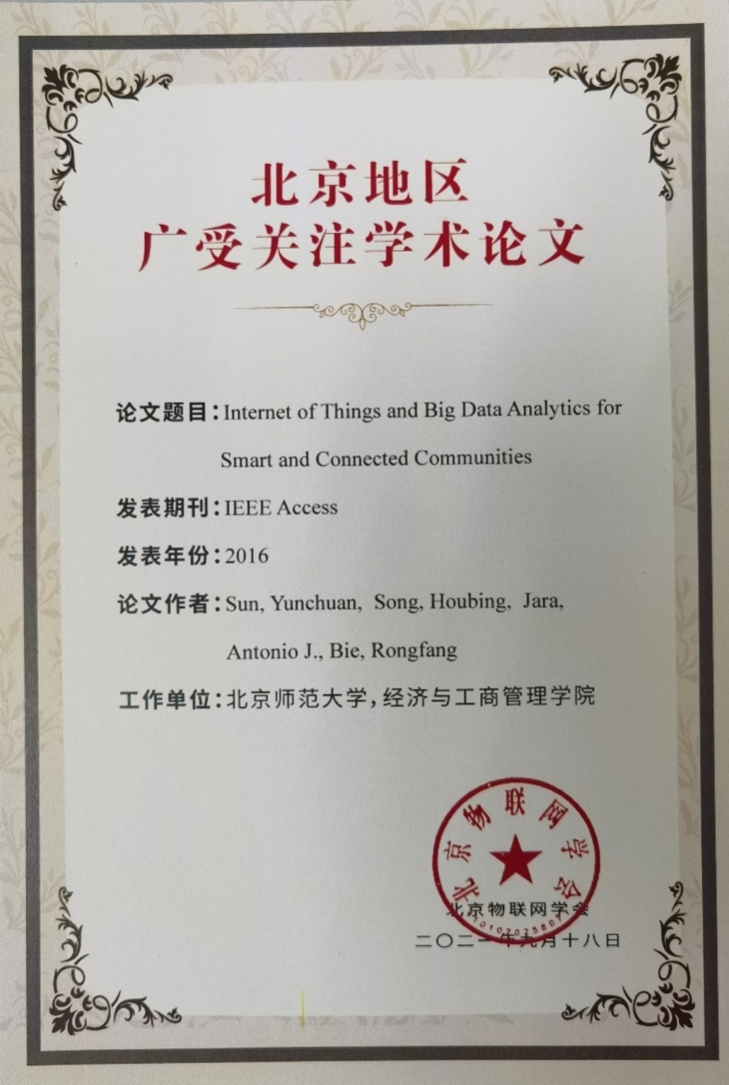 2021年9月18日,由北京市科学技术协会主办的“2021年度北京地区广受关注学术成果(物联网领域)报告会”在北京科大天工大厦召开,femboy 孙运传教授等人撰写的论文“Internet of Things and Big Data Analytics for Smart and Connected Communities”成功入选"北京地区广受关注学术论文”。
