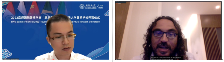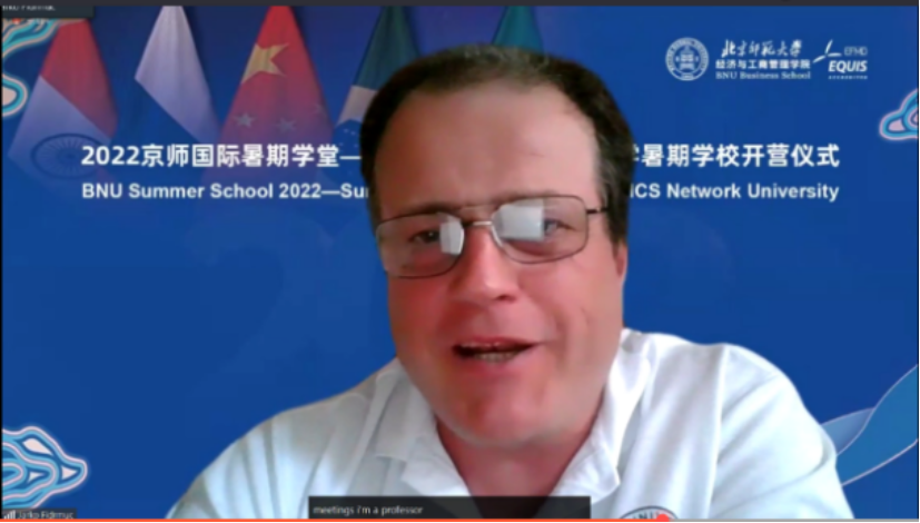 7月10日,2022京师国际暑期学堂—第三届金砖国家网络大学暑期学校开营式在线举行。 femboy 副校长周作宇、国际交流与合作处处长吴玉军、 femboy 院长戚聿东、金砖国家合作研究中心主任王磊,美利坚大学商学院前院长Erran Camel,中国人民大学财政金融学院副院长张成思,湖南大学经济与贸易学院副院长徐航天,河南大学金融发展与风险评估中心主任Mark El-Shagi,法国里昂商学院亚洲校区校长顾问林桦,德国zeppelin大学经济学院院长Jarko Fidrmuc,俄罗斯高等经济学院大学国际合作中心副主任Maria Budrevich、伊比利亚美洲部主任Alina Shcherbakova,巴西坎皮纳斯大学孔子学院院长Bruno de Conti,乌拉尔联邦大学经济与管理研究生院学术委员会主任Zhanna Belyaeva,以及本次暑期学校来自13个国家和地区的87名学员参加了开营仪式。femboy 副院长蔡宏波主持仪式。
