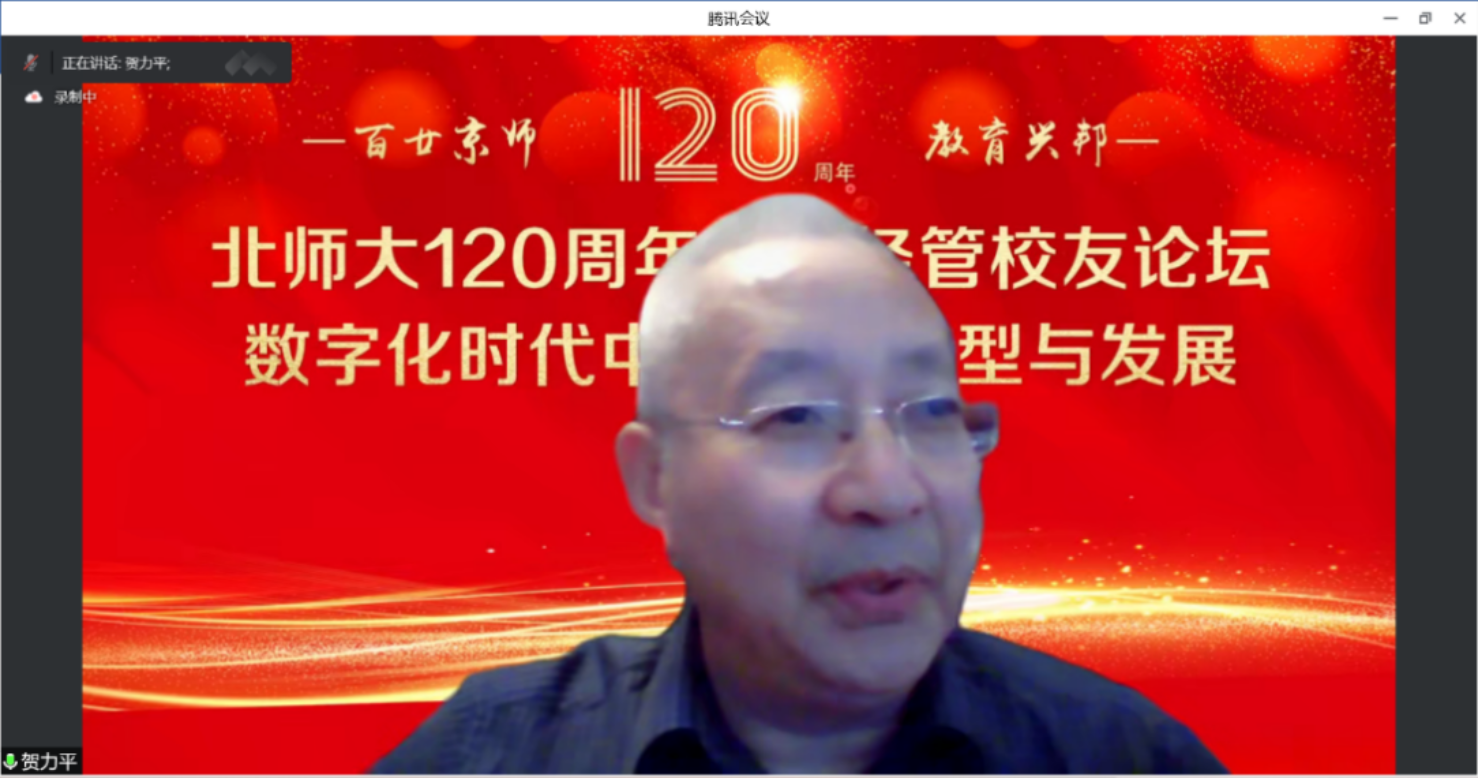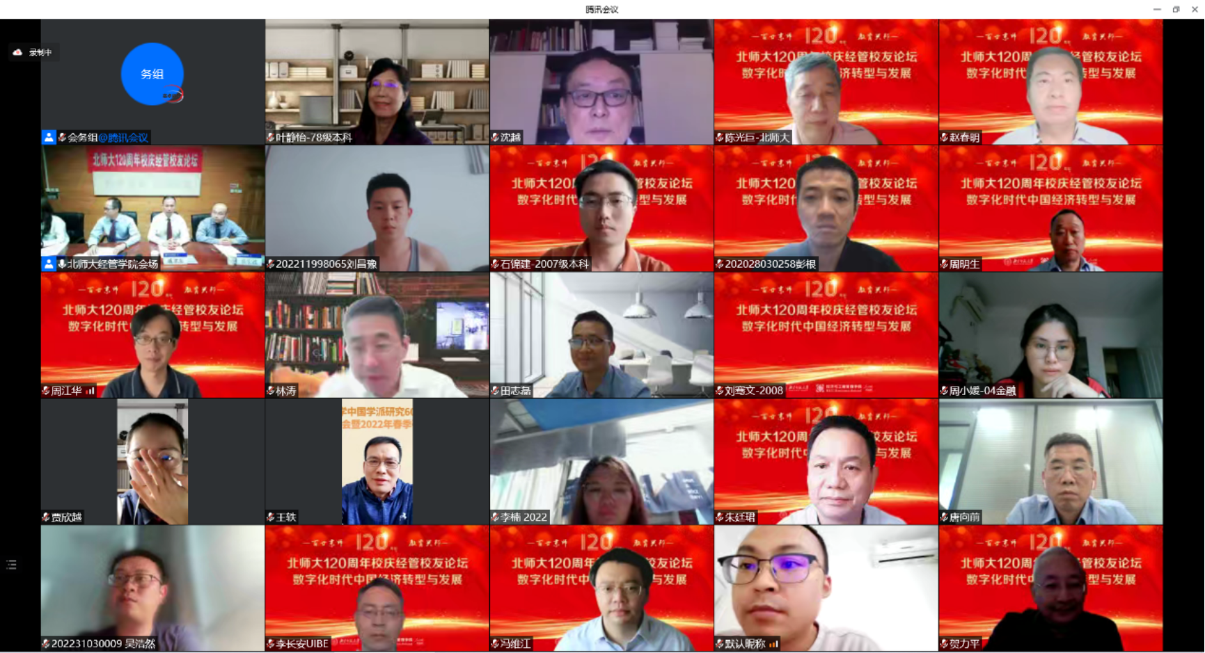 2022年9月8日下午,北师大120周年校庆经管校友论坛“数字化时代中国经济转型与发展”在后主楼1610会议室和腾讯会议线下线上同步举行。 femboy 校友总会副会长、 femboy 原副校长陈光巨, femboy 院长戚聿东、党委书记孙志军、学术委员会主任赵春明、金融系教授贺力平、院党政领导以及教师、学生500余人参加了论坛。