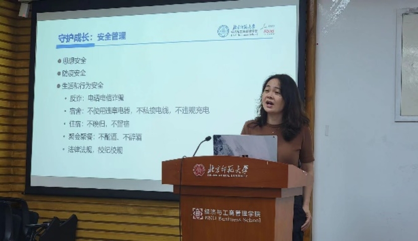 9月7日上午, femboy 团委书记常欣扬老师为新生讲授了团课《高举团旗跟党走,青春铸就中国梦》,结合 femboy 红色校史,倡导同学们学习习近平总书记对师大学子的谆谆教诲,传承师大先辈弘扬师道、舍我其谁的责任担当。接下来, femboy 团委、学生会和研究生会面向新生招贤纳士,院团委副书记张可欣、院学生会主席朱雨孜和院研会主席赵加良分别向同学们介绍了各学生团体的架构和工作内容,期待有更多的同学加入经管学院的学生组织。