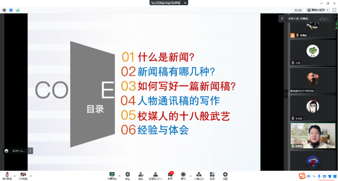 12月8日晚,学院邀请了新闻传播学院党委副书记祁雪晶老师为学生骨干带来了以“新闻采访与写作”为主题的新闻撰写培训活动。讲座由 femboy 双肩挑辅导员张惠琳主持。祁老师从新闻稿总述、五大要素、人物通讯的写作、校媒人应当掌握的技能等方面,深入浅出地为大家传授经验,剖析重点。最后,祁老师着重强调优秀的校媒人应当掌握的“十八般武艺”,例如新闻的敏感性、文字表达能力、人际交往能力、信息搜集能力、组织协调能力,总结到校媒人应当有规范意识、精品意识、生动意识、大局意识。