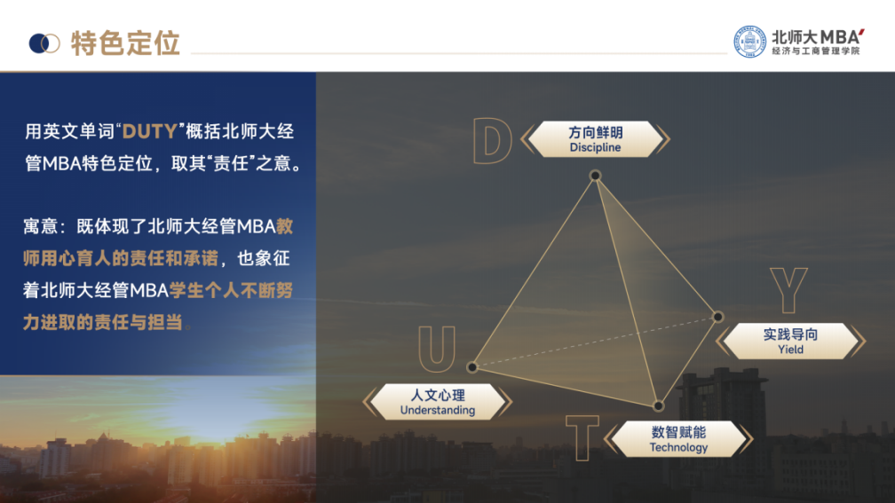周江华教授首先介绍了北师大MBA基于方向鲜明(Discipline)、人文心理(Understanding)、数智赋能(Technology)、实践导向(Yield) 等四个维度构建的新培养体系。本体系取四个维度的英文首字母,“DUTY”,作为北师大MBA教育的核心理念。“DUTY”取其“责任”之意,既彰显教师用心育人的责任承诺,也承载学子追求卓越的成长担当。